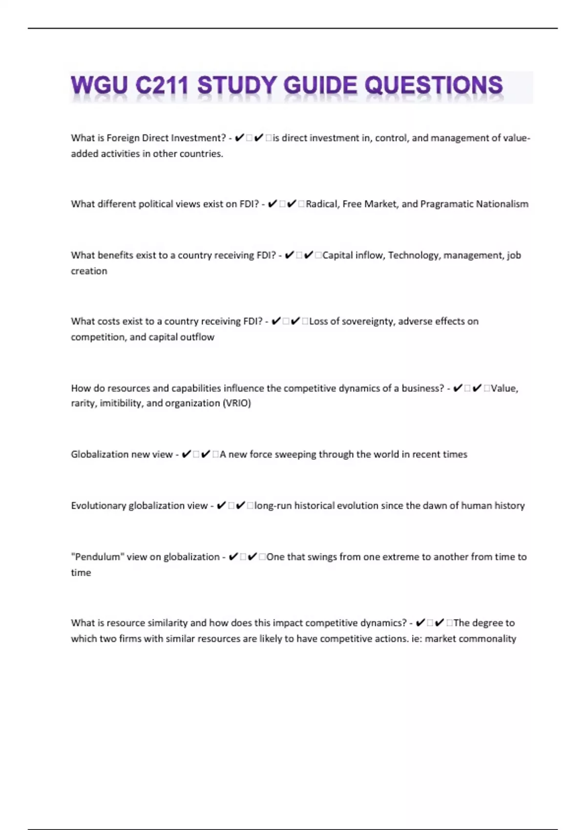 What is Foreign Direct Investment? - ️️is direct investment in, control, and management of value-added activities in other countries. What different political views exist on FDI? - ️️Radical, Free Market, and Pragramatic Nationalism What benefits exist to a country receiving FDI? - ️️Capital inflow, Technology, management, job creation What costs exist to a country receiving FDI? - ️️Loss of sovereignty, adverse effects on competition, and capital outflow How do resources and capabilities influence the competitive dynamics of a business? - ️️Value, rarity, imitibility, and organization (VRIO) Globalization new view - ️️A new force sweeping through the world in recent times Evolutionary globalization view - ️️long-run historical evolution since the dawn of human history "Pendulum" view on globalization - ️️One that swings from one extreme to another from time to time What is resource similarity and how does this impact competitive dynamics? - ️️The degree to which two firms with similar resources are likely to have competitive actions. ie: market commonality
