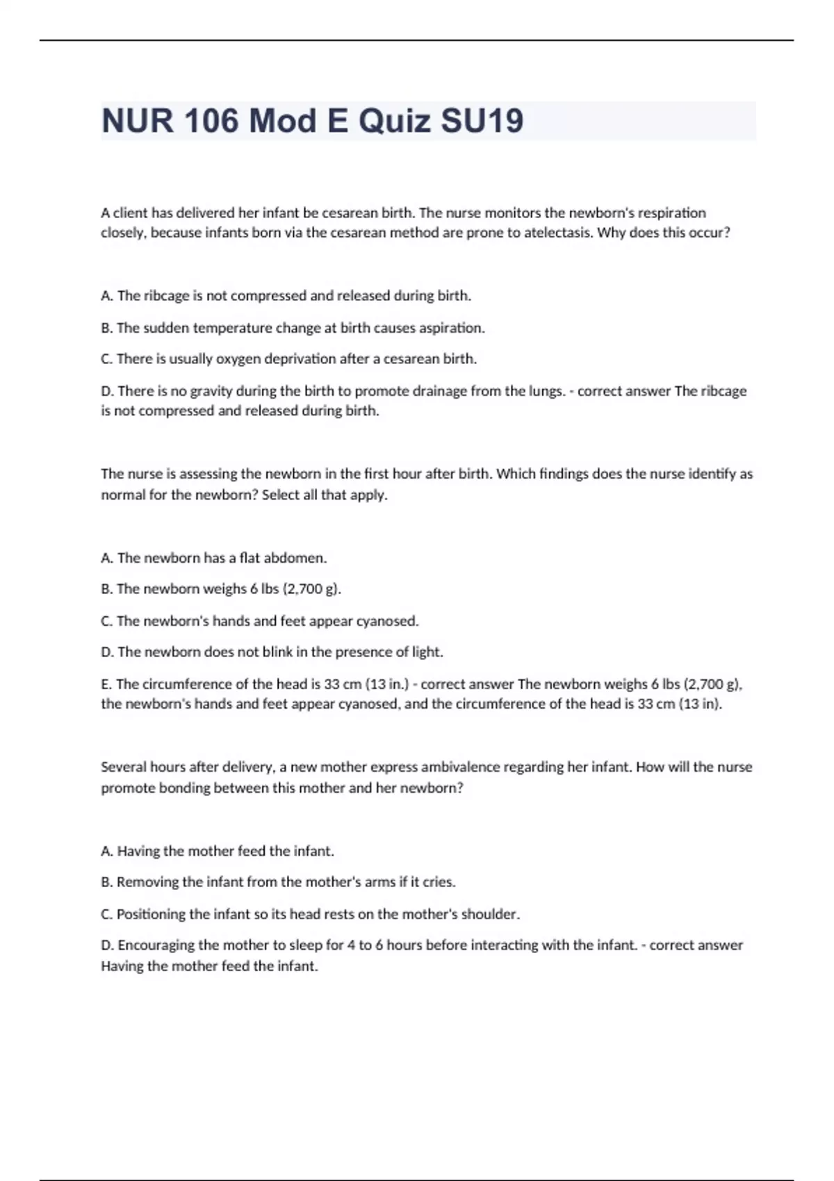 A client has delivered her infant be cesarean birth. The nurse monitors the newborn's respiration closely, because infants born via the cesarean method are prone to atelectasis. Why does this occur? A. The ribcage is not compressed and released during birth. B. The sudden temperature change at birth causes aspiration. C. There is usually oxygen deprivation after a cesarean birth. D. There is no gravity during the birth to promote drainage from the lungs. - correct answer The ribcage is not compressed and released during birth. The nurse is assessing the newborn in the first hour after birth. Which findings does the nurse identify as normal for the newborn? Select all that apply. A. The newborn has a flat abdomen. B. The newborn weighs 6 lbs (2,700 g). C. The newborn's hands and feet appear cyanosed. D. The newborn does not blink in the presence of light. E. The circumference of the head is 33 cm (13 in.) - correct answer The newborn weighs 6 lbs (2,700 g), the newborn's hands and feet appear cyanosed, and the circumference of the head is 33 cm (13 in). Several hours after delivery, a new mother express ambivalence regarding her infant. How will the nurse promote bonding between this mother and her newborn? A. Having the mother feed the infant. B. Removing the infant from the mother's arms if it cries. C. Positioning the infant so its head rests on the mother's shoulder.