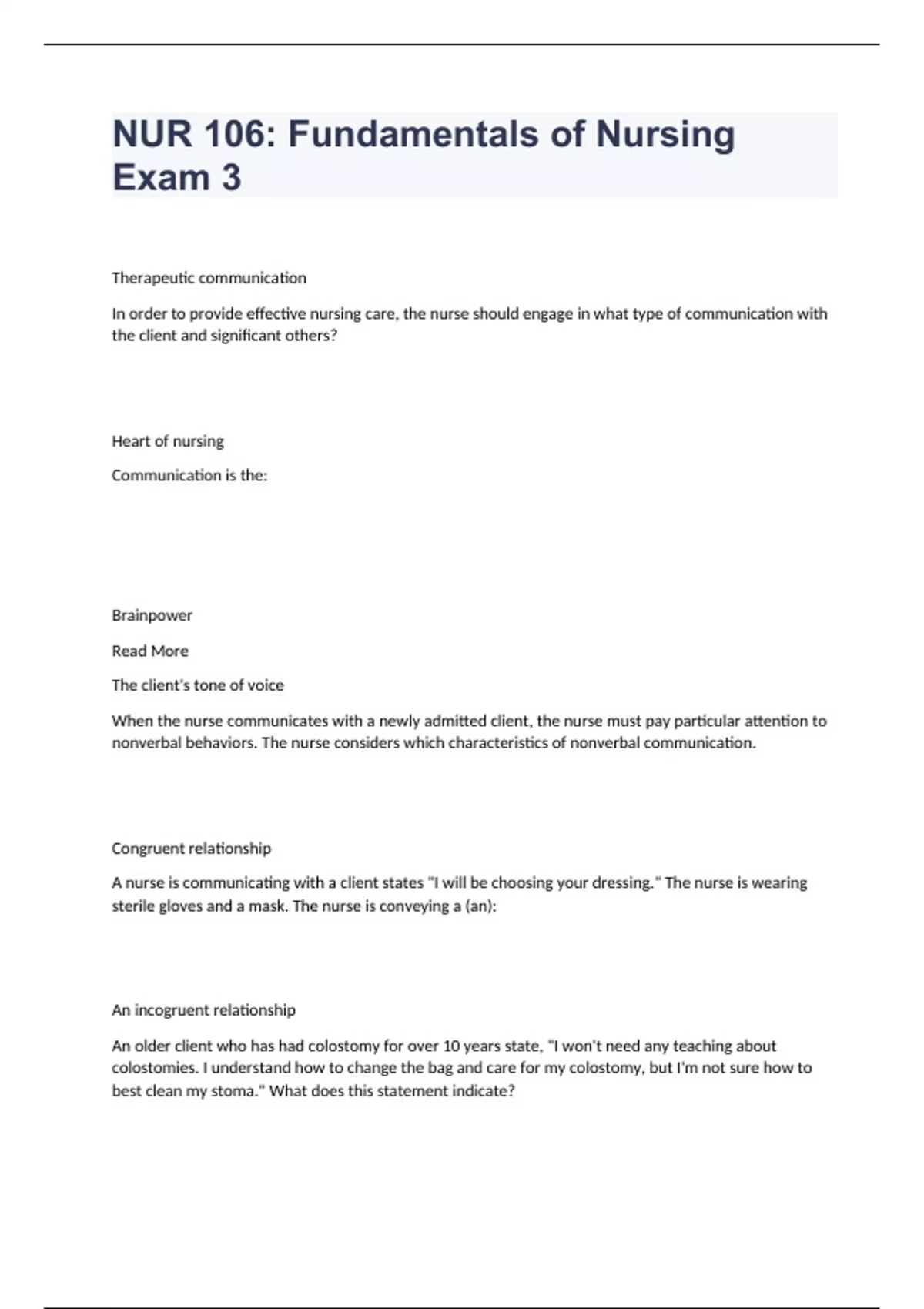 Therapeutic communication In order to provide effective nursing care, the nurse should engage in what type of communication with the client and significant others? Heart of nursing Communication is the: Brainpower Read More The client's tone of voice When the nurse communicates with a newly admitted client, the nurse must pay particular attention to nonverbal behaviors. The nurse considers which characteristics of nonverbal communication. Congruent relationship A nurse is communicating with a client states "I will be choosing your dressing." The nurse is wearing sterile gloves and a mask. The nurse is conveying a (an): An incogruent relationship