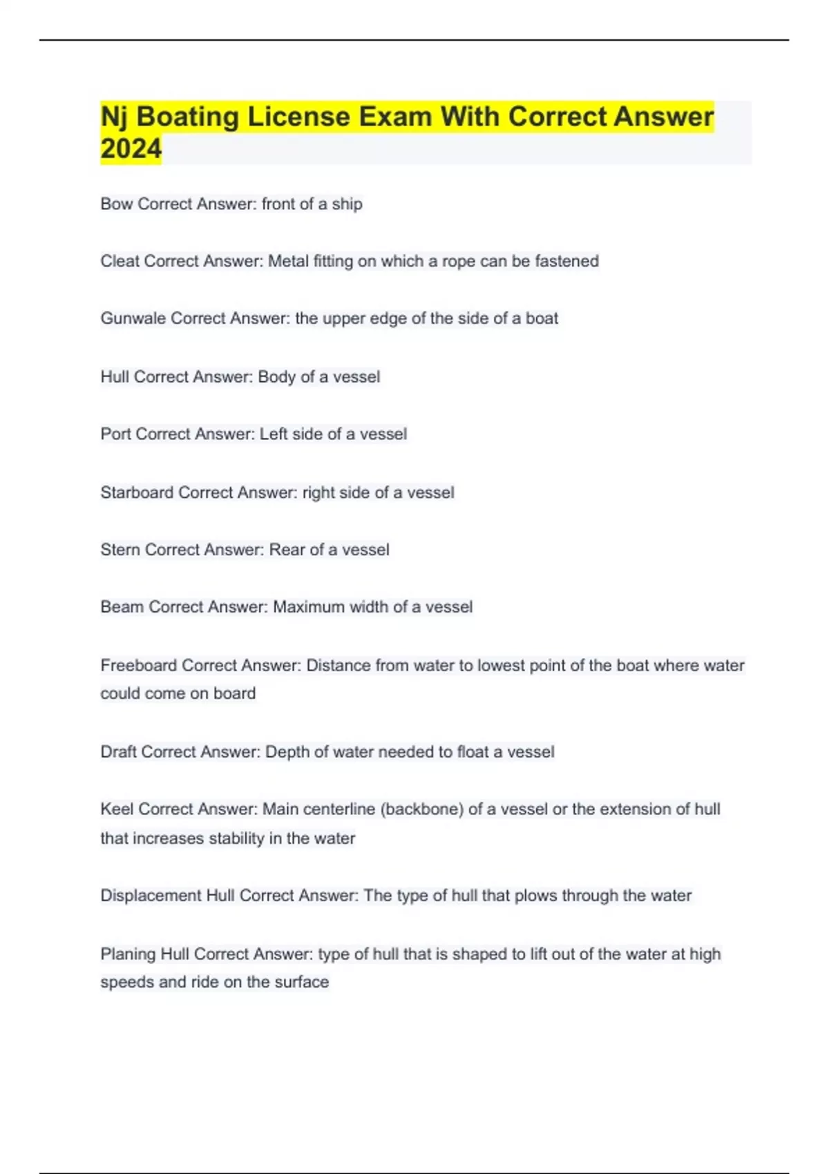 Nj Boating License Exam With Correct Answer 2024 Bow Correct Answer: front of a ship Cleat Correct Answer: Metal fitting on which a rope can be fastened Gunwale Correct Answer: the upper edge of the side of a boat Hull Correct Answer: Body of a vessel Port Correct Answer: Left side of a vessel Starboard Correct Answer: right side of a vessel Stern Correct Answer: Rear of a vessel Beam Correct Answer: Maximum width of a vessel Freeboard Correct Answer: Distance from water to lowest point of the boat where water could come on board Draft Correct Answer: Depth of water needed to float a vessel Keel Correct Answer: Main centerline (backbone) of a vessel or the extension of hull that increases stability in the water Displacement Hull Correct Answer: The type of hull that plows through the water Planing Hull Correct Answer: type of hull that is shaped to lift out of the water at high speeds and ride on the surface Vessels that have planing hulls Correct Answer: most small vessels, PWC's, and small sailboats all have: Personal Watercraft Correct Answer: A small vessel that uses an inboard jet drive as its primary source of propulsion, and is designed to be operated by a person or persons sitting, standing, or kneeling on the vessel rather than inside the vessel Displacement Mode Correct Answer: A planing hull, when operated at very slow speeds, will cut through the water like a displacement hull.