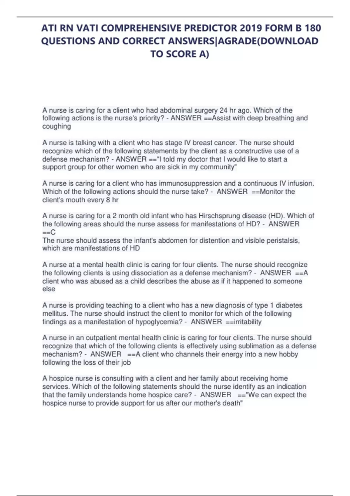 ATI RN VATI COMPREHENSIVE PREDICTOR 2019 FORM B 180 QUESTIONS AND CORRECT ANSWERS|AGRADE(DOWNLOAD TO SCORE A) A nurse is caring for a client who had abdominal surgery 24 hr ago. Which of the following actions is the nurse's priority? - ANSWER ==Assist with deep breathing and coughing A nurse is talking with a client who has stage IV breast cancer. The nurse should recognize which of the following statements by the client as a constructive use of a defense mechanism? - ANSWER =="I told my doctor that I would like to start a support group for other women who are sick in my community" A nurse is caring for a client who has immunosuppression and a continuous IV infusion. Which of the following actions should the nurse take? - ANSWER ==Monitor the client's mouth every 8 hr A nurse is caring for a 2 month old infant who has Hirschsprung disease (HD). Which of the following areas should the nurse assess for manifestations of HD? - ANSWER ==C The nurse should assess the infant's abdomen for distention and visible peristalsis, which are manifestations of HD A nurse at a mental health clinic is caring for four clients. The nurse should recognize the following clients is using dissociation as a defense mechanism? - ANSWER ==A client who was abused as a child describes the abuse as if it happened to someone else A nurse is providing teaching to a client who has a new diagnosis of type 1 diabetes mellitus. The nurse should instruct the client to monitor for which of the following findings as a manifestation of hypoglycemia? - ANSWER ==irritability A nurse in an outpatient mental health clinic is caring for four clients. The nurse should recognize that which of the following clients is effectively using sublimation as a defense mechanism? - ANSWER ==A client who channels their energy into a new hobby following the loss of their job A hospice nurse is consulting with a client and her family about receiving home services. Which of the following statements should the nurse identify as an indication that the family understands home hospice care? - ANSWER =="We can expect the hospice nurse to provide support for us after our mother's death" ATI RN VATI COMPREHENSIVE PREDICTOR 2019 FORM B 180 QUESTIONS AND CORRECT ANSWERS|AGRADE(DOWNLOAD TO SCORE A) A nurse is caring for a client who has active tuberculosis. Which of the following actions should the nurse take? - ANSWER ==Assign the client to a private room with negative air pressure A nurse is providing teaching to a client who is at 24 weeks of gestation and is schedule for a 3 hour oral glucose tolerance test. Which of the following instructions should the nurse include in the teaching? - ANSWER =="You will need to fast the night before the test" A nurse on a pediatric unit has received change of shift report for four children. Which of the following children should the nurse assess first? - ANSWER ==A 10 year old child who is awaiting surgery for an appendectomy and experienced sudden relief from pain A nurse in a community center is providing an education session to a group of clients about ovarian cancer. Which of the following manifestations of ovarian cancer should the nurse include in the teaching? - ANSWER ==Abdominal bloating A nurse is caring for a client who is postoperative after receiving moderate (conscious) sedation. The client suddenly becomes restless and reports feeling lightheaded. Which of the following actions should the nurse take? - ANSWER ==Check the client's oxygen saturation level A nurse is working in an emergency department is triaging four clients. Which of the following clients should the nurse recommend for treatment first? - ANSWER ==A middle adult client who has unstable vital signs A nurse is providing teaching for a client who has a fracture of the right fibula with a short leg cast in place and a new prescription for crutches. The client is non-weight bearing for 6 weeks. Which of the following instructions should the nurse include in the teaching? - ANSWER ==Use a three-point gai