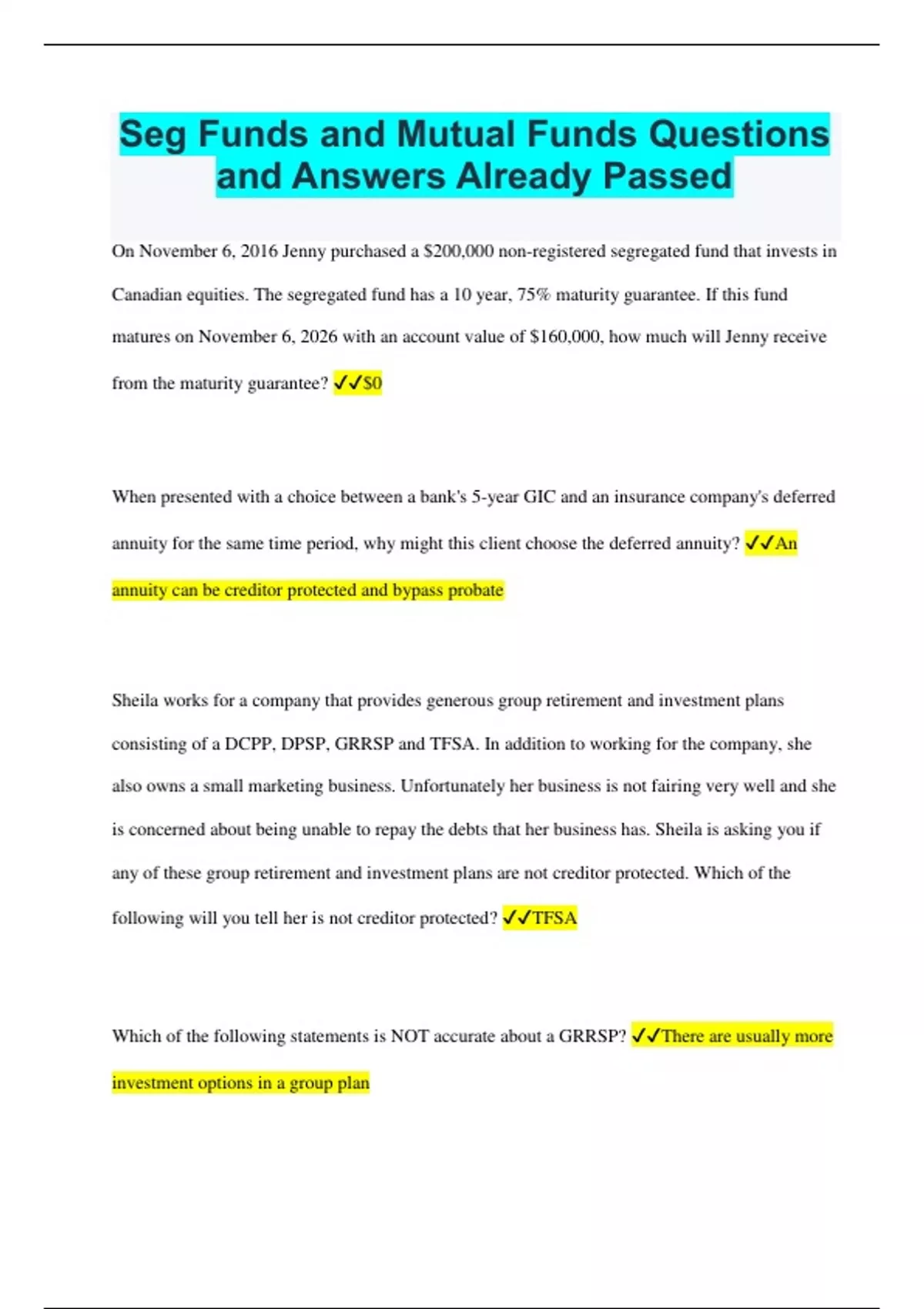Seg Funds and Mutual Funds Questions and Answers Already Passed