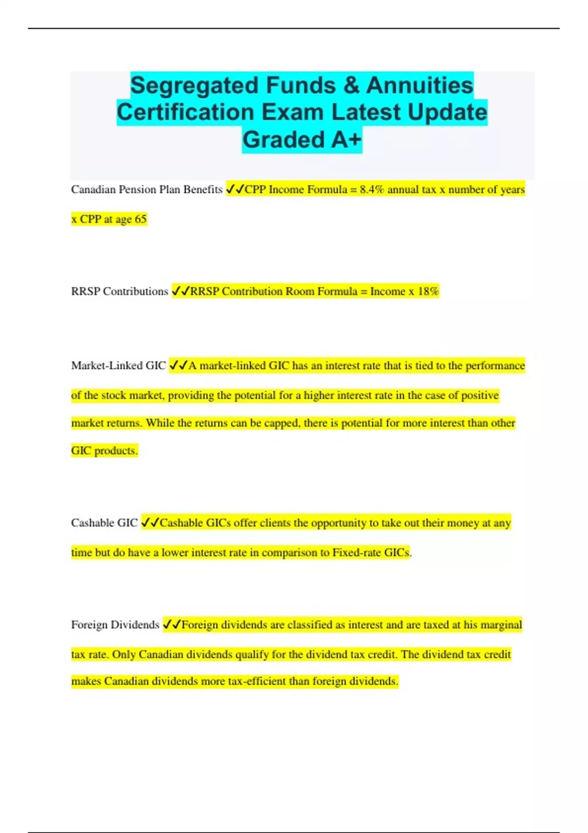 Segregated Funds & Annuities Certification Exam Latest Update Graded A+ Canadian Pension Plan Benefits CPP Income Formula = 8.4% annual tax x number of years x CPP at age 65 RRSP Contributions RRSP Contribution Room Formula = Income x 18% Market-Linked GIC A market-linked GIC has an interest rate that is tied to the performance of the stock market, providing the potential for a higher interest rate in the case of positive market returns. While the returns can be capped, there is potential for more interest than other GIC products. Cashable GIC Cashable GICs offer clients the opportunity to take out their money at any time but do have a lower interest rate in comparison to Fixed-rate GICs. Foreign Dividends Foreign dividends are classified as interest and are taxed at his marginal tax rate. Only Canadian dividends qualify for the dividend tax credit. The dividend tax credit makes Canadian dividends more tax-efficient than foreign dividends. Annuity Advantages Some advantages of annuities include: No worry about outliving one's money when a life annuity or joint and last survivor annuity is purchased. I If the annuity is prescribed, less tax may be due in the early years of payment. Only an annuity is guaranteed for life and can manage longevity risk. Canadian Investor Protection Fund (CIPF) For stock investors, the CIPF (the Canadian Investor Protection Fund) provides investor protection in the case of dealer insolvency. In the case of dealer insolvency (but not market losses) The Canadian Investor Protection Fund (CIPF) and the Investor Protection Corporation (IPC) of the Mutual Fund Dealers Association (MFDA) insure MFDA members. The maximum amount of coverage is $1 million for each general account. Exchange Traded Fund (ETF) Exchange-Traded Funds; are highly transparent are professionally managed have no-load fees allow for commodity investing by tracking an index are convenient to buy and sell Return of Bond Factors A bond issuer pledges to repay the face amount of the bond at maturity and to make interim interest payments to the investor. There are many factors that affect the return of a bond. They include: Interest (coupon) rate; Maturity date; Credit quality; and Price. The face amount is not a factor that affects the return of the bond. Bond Interest Interest from a bond is usually paid semi-annually or two times a year. Indexed Annuities The indexed annuity has a payment amount that increases based on inflation over the contract term and is therefore unknown at the time of purchase. Despite the total future payout for an indexed annuity being unknown, they are attractive for investors: annuitants have a known minimum guaranteed payout and the assurance that their payments will fully or partially keep pace with inflation. Future Value Formula FV = PV x (1 + interest rate)n Canadian Investment Funds Standards Committee (CIFSC) The Canadian Investment Funds Standards Committee is responsible for classifying investments. It's five asset classes are: Cash Fixed income Equity Commodity Other.