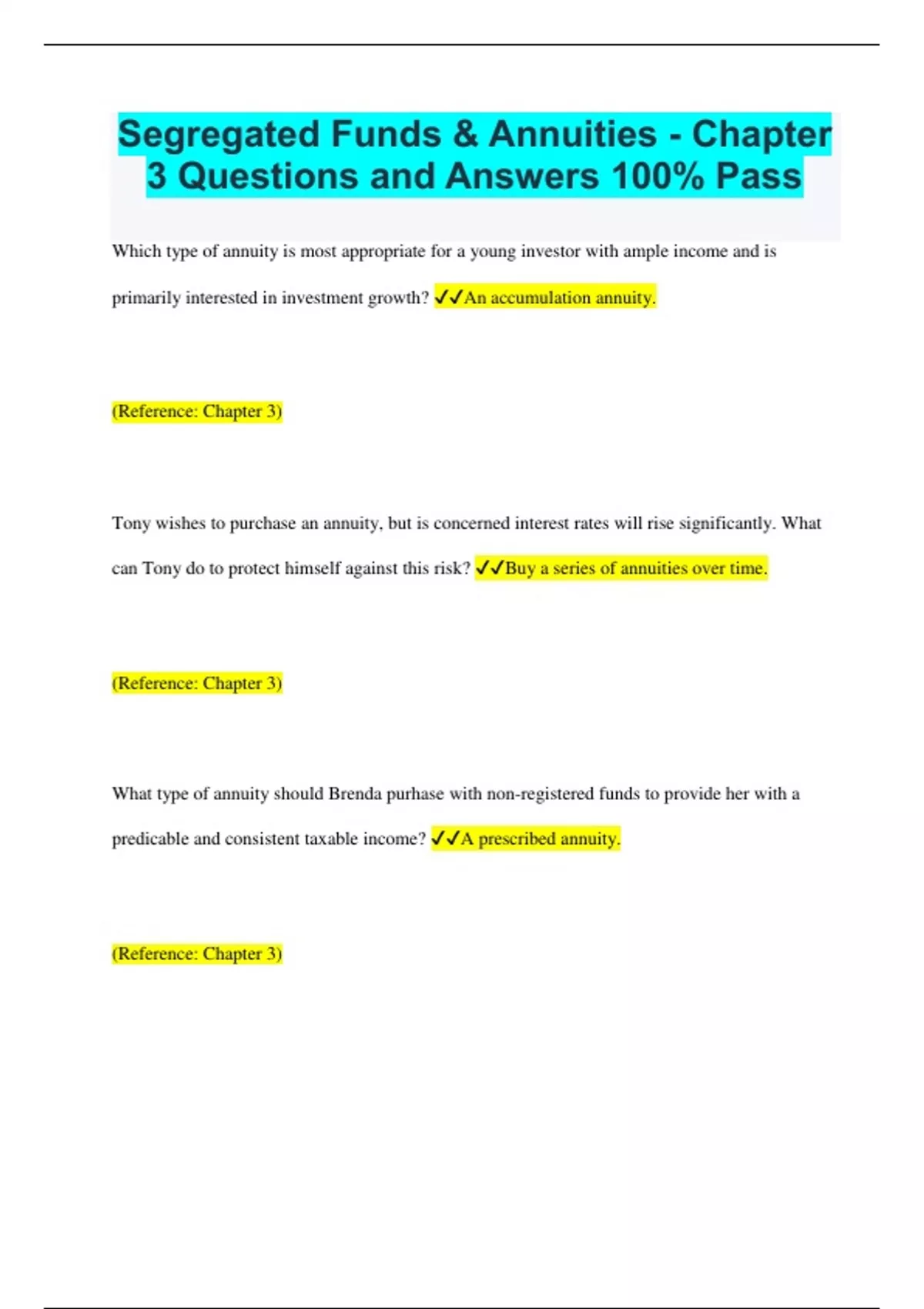 Segregated Funds & Annuities - Chapter 3 Questions and Answers 100% Pass Which type of annuity is most appropriate for a young investor with ample income and is primarily interested in investment growth? An accumulation annuity. (Reference: Chapter 3) Tony wishes to purchase an annuity, but is concerned interest rates will rise significantly. What can Tony do to protect himself against this risk? Buy a series of annuities over time. (Reference: Chapter 3) What type of annuity should Brenda purhase with non-registered funds to provide her with a predicable and consistent taxable income? A prescribed annuity. (Reference: Chapter 3) What is an annuity contract? Provides periodic payments to be received by an annuitant in consideration of a lump sum or a series of sums deposited to the contract. (Reference: Chapter 3) Who is a co-annuitant? Each of the two annuitants in a joint-life annuity. (Reference: Chapter 3) What is an impaired annuity? An annuity based on the life of an annuitant with a shortened life expectancy. Also known as an enhanced annuity or age-related annuity. (Reference: Chapter 3) What is a joint and last survivor annuity? An annuity which, after the death of the annuitant, continues to be paid in whole or in part to the co-annuitant named in the contract, until their death. (Reference: Chapter 3) What is a Locked-in Retirement Account (LIRA)? An account created for the transfer of funds from a defined benefit pension plan, defined contribution pension plan or pooled registered pension plans. (Reference: Chapter 3) They are funded by a premium or a deposit to the annuity contract by the contract's owner. How are payout annuities funded? 1. Easy to understand 2. Income security 3. Creditor protection 4. Estate planning benefits 5. Annuitant protection What are the advantages of annuities? The person that receives money from the annuity contract. The annuitant may also be known as the "annuitant grantee" or "payee". What is an annuitant? All annuitants know when to expect their annuity payment based on the schedule in the annuity contract. Annuities with a level, or set, payment provide income security because the annuitant also knows in advance how much each payment will be. This is guaranteed by the issuer. This knowledge allows the annuitant to plan his finances and spending, which is one of the reasons annuities are a good choice for retirement income. Why are annuities a good choice for retirement income? The risk of outliving one's money. What risk does lifetime income eliminate? Locked-in retirement account What does LIRA stand for? 1. A named beneficiary and the beneficiary must be designated as irrevocable, or be a spouse, child, grandchild, or parent. 2. The annuity contract must have been purchased before the owner became insolvent Name one of the conditions that must be met in order for creditor protection to be valid. Permanent life insurance and a life annuity. What two products make an insured annuity? A payout annuity pays income. The income stream is a blend of interest and principal created from the deposit of capital to the contract and is based on the annuity rate applied at the time the contract is issued What is the purpose of a payout annuity? An accumulation annuity is a form of savings with a maturity date. An income stream is not created by an accumulation annuity. Its purpose is investment growth. What is the purpose of an accumulation annuity? When a single life is the basis for the contract, the annuity is called a 'single' or straight life contract. When is an annuity called a "single"? No. When registered savings are the source of funding the policy owner and annuitant must be the same When registered savings are the source of funding for a life annuity, can the policy owner and annuitant be different people? It may begin immediately or at a selected future date. When does annuity income begin? Accumulation and income What are the two phases of a deferred income annuity? A level payment is a payment that is the same for the duration of the annuity. What is level income? Indexed income is income that increases over the payment period. Indexing an annuity increases payments annually by a percentage selected by a percentage selected by the policy owner. What is indexed income? Consumer Price Index What does CPI stand for? A variable income annuity is an immediate life annuity with the ability for the annuitant to earn market-linked returns What is a variable income annuity? The annuity rate is a dollar figure quoted to future policy owners based on the current interest rate and other factors that pertain to the annuitant and how the annuity contract is structured. What is the annuity rate? The age of the annuitant when payments begin is a significant contributor to the amount received as income from life annuities. The older the annuitant, the more paid since lifespan is a shorter period of time. How does the age of the annuitant affect the annuity rate? - To guarantee that, in the event of death during a term annuity, an equivalent amount is still paid out from the contract. - To guarantee an income for a spouse - To guarantee that, at minimum, the premium paid to purchase the annuity contract is repaid to the investor What are the reasons an annuity would have a guarantee? The beneficiary receives an amount corresponding to the difference between payments received before death and the initial capital. The annuity is called 'a cash refund annuity' if the beneficiary receives a lump sum. What is a cash refund annuity? There would be no payment made to a beneficiary. The balance of the sum invested with the insurer would then belong to the insurer. What happens if the annuitant of a single life contract dies after receiving his first monthly payment on a non-guaranteed annuity? It can be managed by adding a guarantee period and beneficiary to the contract. How can the risk of loss of capital be managed in regards to a life annuity? Market Value Adj