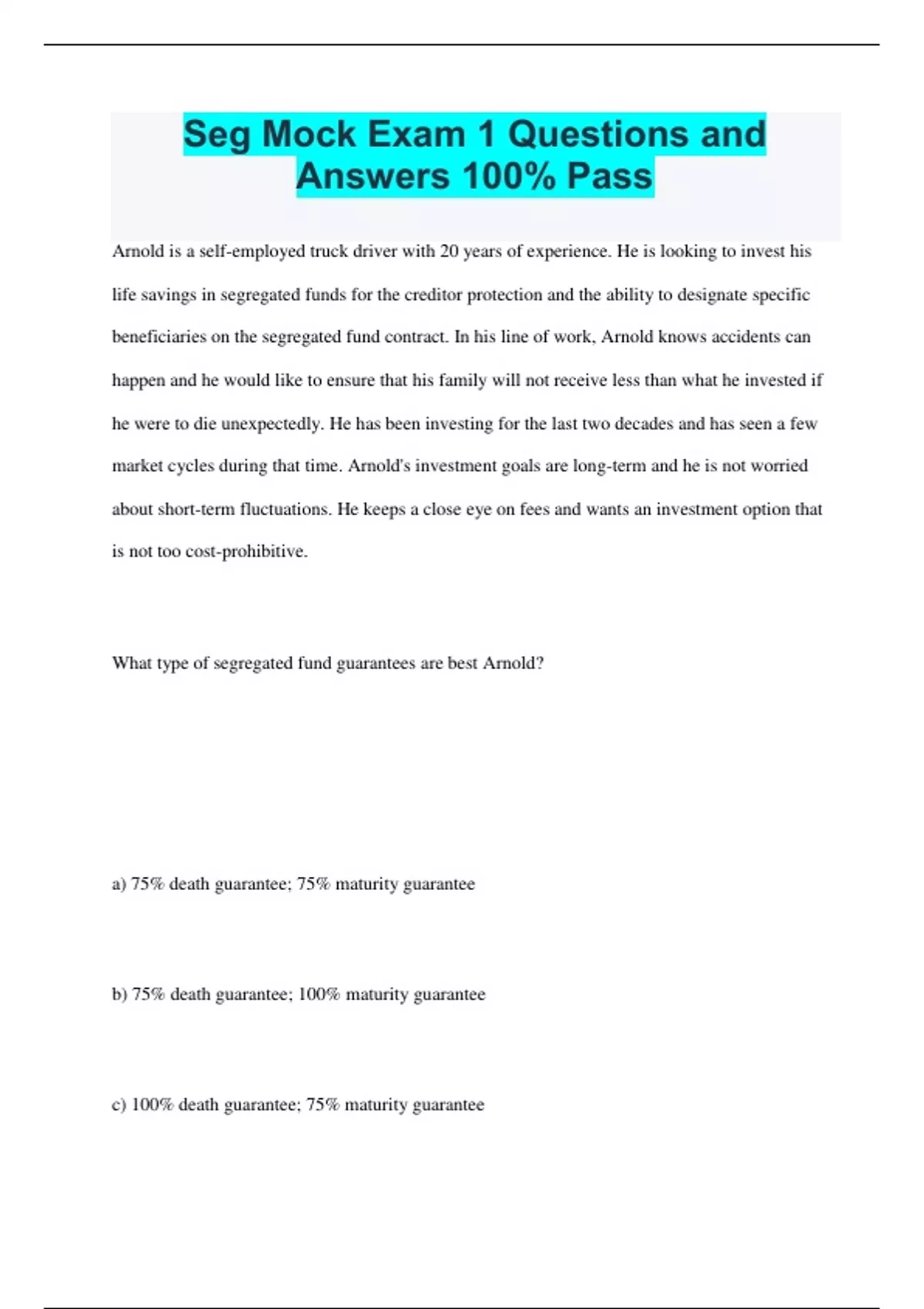 Seg Mock Exam 1 Questions and Answers 100% Pass Arnold is a self-employed truck driver with 20 years of experience. He is looking to invest his life savings in segregated funds for the creditor protection and the ability to designate specific beneficiaries on the segregated fund contract. In his line of work, Arnold knows accidents can happen and he would like to ensure that his family will not receive less than what he invested if he were to die unexpectedly. He has been investing for the last two decades and has seen a few market cycles during that time. Arnold's investment goals are long-term and he is not worried about short-term fluctuations. He keeps a close eye on fees and wants an investment option that is not too cost-prohibitive. What type of segregated fund guarantees are best Arnold? a) 75% death guarantee; 75% maturity guarantee b) 75% death guarantee; 100% maturity guarantee c) 100% death guarantee; 75% maturity guarantee d) 100% death guarant (corect) 100% death guarantee; 75% maturity guarantee Rationale: If Arnold dies, he wants his family to receive at least the amount that he invested. To meet this need, the death guarantee must be 100%. However, since he is comfortable with short-term fluctuations, is investing for the long-term and is sensitive to cost, a 75% maturity guarantee would be sufficient for him. (Refer to Section 5.2.3) Johnson is a member of a Group Registered Retirement Savings Plan (GRRSP), to which he and his employer each contribute 5% of his earnings. He is planning to leave his employer for a higher paying job. Johnson wonders whether his GRRSP has vested and whether he has ownership rights on the employer's contributions. When do contributions to GRRSPs vest? a) Two years b) Four years c) 30 days d) Immediately (wrong) Two years Rationale: Contributions to a GRRSP vest immediately. (Refer to Section 8.2.2.0) Navinder wants to know the differences between automatic resets and voluntary resets in a segregated fund contract. Which of the following is correct? a) Automatic resets extend the contract every time the value of the contract goes up. b) Voluntary resets can be made only