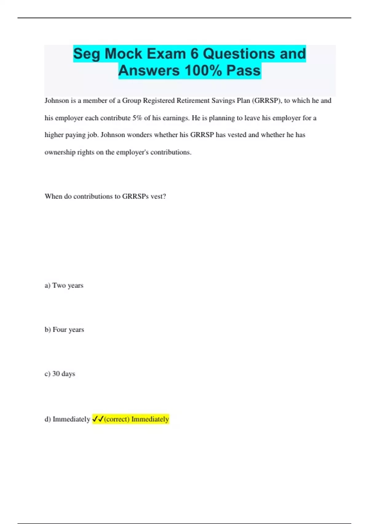 Seg Mock Exam 6 Questions and Answers 100% Pass Johnson is a member of a Group Registered Retirement Savings Plan (GRRSP), to which he and his employer each contribute 5% of his earnings. He is planning to leave his employer for a higher paying job. Johnson wonders whether his GRRSP has vested and whether he has ownership rights on the employer's contributions. When do contributions to GRRSPs vest? a) Two years b) Four years c) 30 days d) Immediately (correct) Immediately Rationale: Contributions to a GRRSP vest immediately. (Refer to Section 8.2.2.0) Rose owns a segregated fund contract with a 100% maturity and death benefit guarantee. Her daughter, Natalie, has been named the beneficiary of the contract. Rose died today. The contract was started with an investment of $150,000 and Rose had made several partial withdrawals. Today, the contract value is $100,000. As the beneficiary, how much will Natalie receive? a) $150,000 b) The higher of $100,000 or the guaranteed amount adjusted for partial withdrawals c) $150,000 adjusted for partial withdrawals d) $100,000 (correct) The higher of $100,000 or the guaranteed amount adjusted for partial withdrawals Rationale: The beneficiary will receive the higher of the market value or the guaranteed amount after adjustments for partial withdrawals have been made. (Refer to Section 8.7.1.0) Margaret is a new life insurance agent who has just finished her first segregated fund application and collected a client cheque for $5,000. She spent time properly reviewing the details of the contract and explained to her clients the different fees associated with their fund selection. After emailing them the information folder, Margaret went through the questions that they still had. She then completed the application, obtained the clients' signatures, and submitted the signed application. What does Margaret still have to do? a) Make sure that she completes the politically exposed foreign person form and verifies their identification. b)