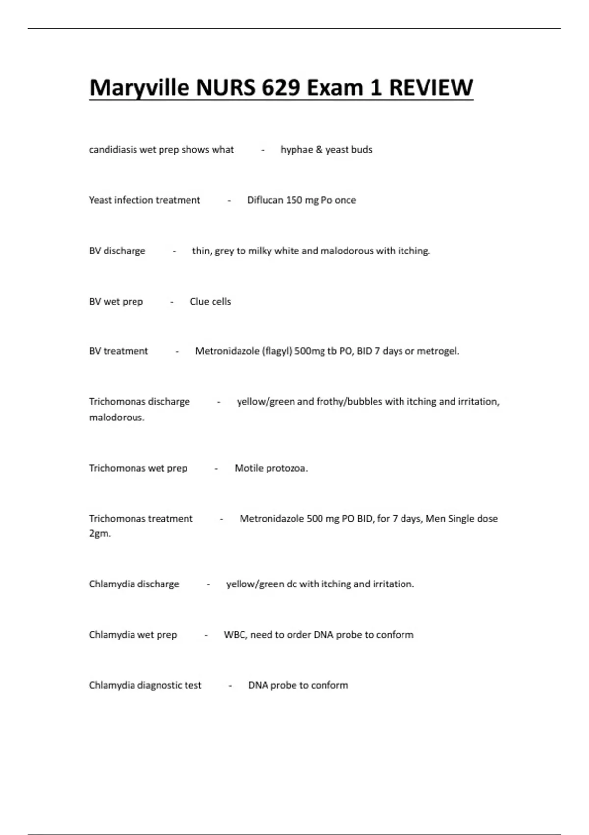 Maryville NURS 629 Exam 1 REVIEW candidiasis wet prep shows what - hyphae & yeast buds Yeast infection treatment - Diflucan 150 mg Po once BV discharge - thin, grey to milky white and malodorous with itching. BV wet prep - Clue cells BV treatment - Metronidazole (flagyl) 500mg tb PO, BID 7 days or metrogel. Trichomonas discharge - yellow/green and frothy/bubbles with itching and irritation, malodorous. Trichomonas wet prep - Motile protozoa. Trichomonas treatment - Metronidazole 500 mg PO BID, for 7 days, Men Single dose 2gm. Chlamydia discharge - yellow/green dc with itching and irritation. Chlamydia wet prep - WBC, need to order DNA probe to conform Chlamydia diagnostic test - DNA probe to conform Chlamydia treatment - Doxycycline 100mg BID 7 days. How to prevent neural tube defects - Folic acid intake 0.4 mcg/day Goodell's sign - The Goodell sign refers to a probable sign of pregnancy, characterized by softening of the cervix. A positive Goodell sign occurs due to increased blood flow noticed in the cervix during the first 4 to 8 weeks of pregnancy Chadwick's sign - due to increased blood flow noticed in the cervix during the first 4 to 8 weeks of pregnancy, which can also give the vaginal part of the cervix a bluish appearance Hegar's sign - softening of the lower segment of the uterus, which occurs around six to 12 weeks of gestation Braxton Hicks - gravidia - A pregnancy regardless of duration and includes present pregnancy Para - Past pregnancies that continued to the period of viability primigravida - first pregnancy multigravida - woman who has been pregnant more than once nullipara - a woman who has not had any children Primipara - Woman who has carried a pregnancy to viability or term multipara - woman who has given birth to two or more children