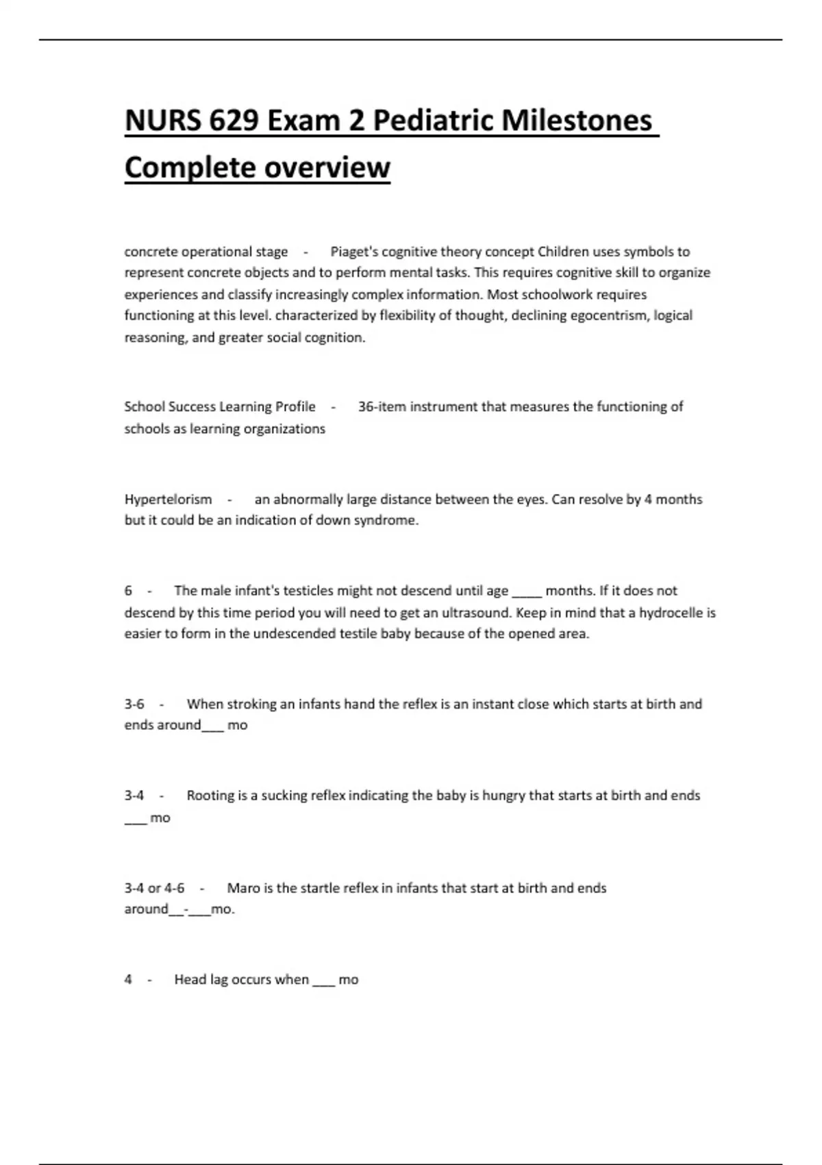 NURS 629 Exam 2 Pediatric Milestones Complete overview