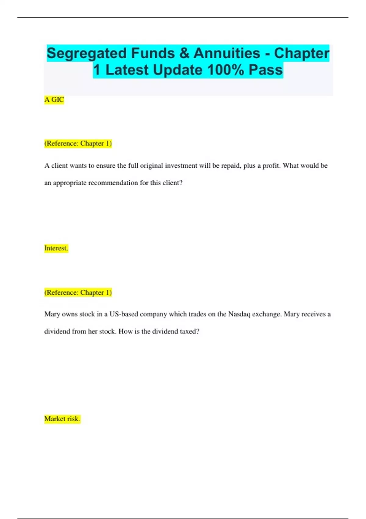 Segregated Funds & Annuities - Chapter 1 Latest Update 100% Pass A GIC (Reference: Chapter 1) A client wants to ensure the full original investment will be repaid, plus a profit. What would be an appropriate recommendation for this client? Interest. (Reference: Chapter 1) Mary owns stock in a US-based company which trades on the Nasdaq exchange. Mary receives a dividend from her stock. How is the dividend taxed? Market risk. (Reference: Chapter 1) What type of risk refers to the possibility that the total financial market could decline due to an uncontrollable event such as a natural disaster? Liquidity risk. (Reference: Chapter 1) Steve is a real estate investor, while Sarah invests in mutual funds. What risk would likely pose a threat to Steve, but not Sarah? The price paid for a bond on the open market, expressed as a factor of dollars per $100 of the face amount. (Reference: Chapter 1) What does bond price refer to? A credit that reduces income tax owed by individual taxpayers on dividends received from qualifying Canadian corporations. (Reference: Chapter 1) What is the dividend tax credit? FV is the value of today's sum of money at a future date, based on a specified rate of return. (Reference: Chapter 1) What does the future value (FV) of money refer to? The impact of the increas