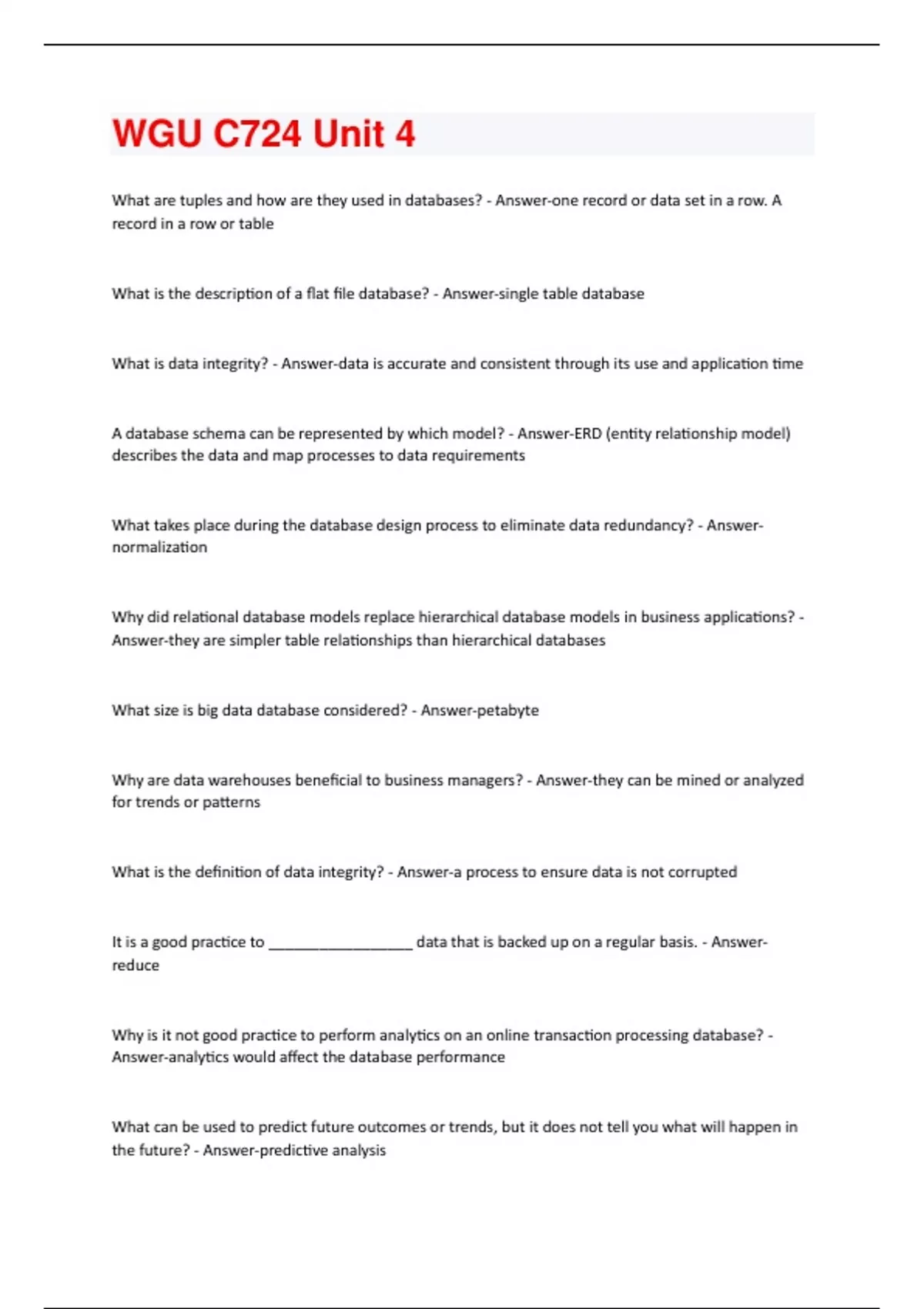 What are tuples and how are they used in databases? - Answer-one record or data set in a row. A record in a row or table What is the description of a flat file database? - Answer-single table database What is data integrity? - Answer-data is accurate and consistent through its use and application time A database schema can be represented by which model? - Answer-ERD (entity relationship model) describes the data and map processes to data requirements What takes place during the database design process to eliminate data redundancy? - Answernormalization Why did relational database models replace hierarchical database models in business applications? - Answer-they are simpler table relationships than hierarchical databases What size is big data database considered? - Answer-petabyte Why are data warehouses beneficial to business managers? - Answer-they can be mined or analyzed for trends or patterns What is the definition of data integrity? - Answer-a process to ensure data is not corrupted It is a good practice to _________________ data that is backed up on a regular basis. - Answerreduce Why is it not good practice to perform analytics on an online transaction processing database? - Answer-analytics would affect the database performance What can be used to predict future outcomes or trends, but it does not tell you what will happen in the future? - Answer-predictive analysisWhere would metadata about customer and product tables be stored? - Answer-data dictionary What is data inconsistency - Answer-what happens when the same attribute has different values because the data is stored in more than one location What does classification do? - Answer-loo