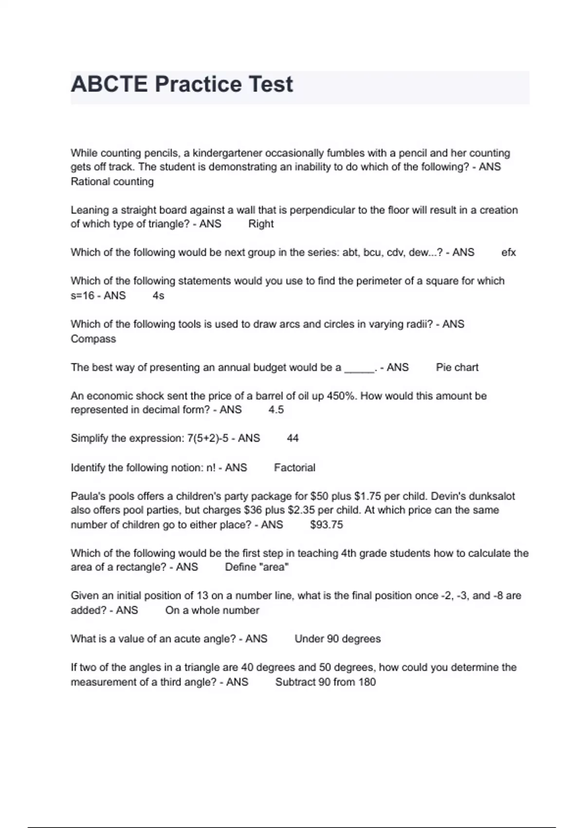 ABCTE Practice Test QABCTE Practice Test While counting pencils, a kindergartener occasionally fumbles with a pencil and her counting gets off track. The student is demonstrating an inability to do which of the following? - ANS Rational counting Leaning a straight board against a wall that is perpendicular to the floor will result in a creation of which type of triangle? - ANS Right Which of the following would be next group in the series: abt, bcu, cdv, dew...? - ANS efx Which of the following statements would you use to find the perimeter of a square for which s=16 - ANS 4s Which of the following tools is used to draw arcs and circles in varying radii? - ANS Compass The best way of presenting an annual budget would be a _____. - ANS Pie chart An economic shock sent the price of a barrel of oil up 450%. How would this amount be represented in decimal form? - ANS 4.5 Simplify the expression: 7(5+2)-5 - ANS 44 Identify the following notion: n! - ANS Factorial Paula's pools offers a children's party package for $50 plus $1.75 per child. Devin's dunksalot also offers pool parties, but charges $36 plus $2.35 per child. At which price can the same number of children go to either place? - ANS $93.75 Which of the following would be the first step in teaching 4th grade students how to calculate the area of a rectangle? - ANS Define "area" Given an initial position of 13 on a number line, what is the final position once -2, -3, and -8 are added? - ANS On a whole number What is a value of an acute angle? - ANS Under 90 degrees If two of the angles in a triangle are 40 degrees and 50 degrees, how could you determine the measurement of a third angle? - ANS Subtract 90 from 180 Which unit of measurement would you most likely use to weigh a grape? - ANS Grams What relevant information is missing from the problem? Buck has 48 miles to go to get back to Bakersfield, but he has only got 3 gallons of gas left. Will he make it? - ANS Miles per gallon Which of the following is an inappropriate use of calculators in teaching elementary math? - ANS Increasing fluency during a subtraction drill In how many different ways can 5 books be arranged on a shelf? - ANS 120 Julian purchased a brand new plasm tv at a local entertainment store for $2,731. Later that week, Julian felt quite proud when he saw the same plasma tv at another store for $3,275. What is the best estimate for the amount of money Julian saved when he bought his plasma tv? - ANS $600 Solve for m: I6mI-2=40 - ANS m=7 or m=-7 Which of the equation below is the equation for a line that is parallel to the x-axis? - ANS y=2 Michael goes to camp for 4 weeks. He has $60 to spend at the camp store. What expression can Michael use to figure out how much money he will have left at the end of camp if he only spends $12 a week? - ANS 60-(12 x 4) Jake has 8 blue socks, 10 red socks, and 12 white socks loose in a drawer. If Jake reaches in twice and pulls out one sock at random each time, what is the probability that Jake will pick out two blue socks? - ANS 28/561 Identify the next three symbols that would follow in this sequence to make it a patter: @-@ - ANS -@ What is the median in the following set of numbers: 2,4,4,5,6,8,10,12 - ANS 5.5 Evaluate .5 x .25 - ANS .125 What is the solution strategy for the following problem: 148 67 +266 Add each place value separately to get: 300+160+21=481 - ANS Partial sum method What is a duplicate of a gene? - ANS Allele In the search for extraterrestrial intelligence, data from the radio telescope at Arecibo, Puerto Rico, is analyzed for what? - ANS Modulated radio transmissions from outer space What is the correct order for the scientific process? - ANS Question, hypothesis, observation, analysis, conclusion Deposited silt is sometimes a beneficial consequence of what natural hazard? - ANS Flood Students are examining a powdery substance that has a constant melting point and neither separates chemically nor physically into other substances. This substance is an example of _____. - ANS Element Mark says, "Ice changing to vapor is a chemical change." This is incorrect because... - ANS This is not a chemical transformation Which layer of the Earth's atmosphere contains the ozone layer? - ANS Stratosphere In ells, what is the role of the endoplasmic reticulum? - ANS Transports proteins Which type of rock is formed from the hardening of magma? - ANS Volcanic Which type of tissue covers and protects the outside of vascular plants? - ANS Dermal The broadest category used in biological sciences to describe and categorize living things is _____. - ANS Kingdom In a scientific experiment, the idea that is presumed true until statistical evidence indicates otherwise is called what? - ANS Null hypothesis Which results in the warming and drastic decline in primary productivity of the Eastern Pacific Ocean? - ANS El Nino The part of the earth where most earthquakes take place is _____. - ANS Crust What temperature represents the freezing point of water? - ANS 32 F 0 C In what phase is the moon when it is between the Earth and the Sun. - ANS New moon Alluvial plains are formed on ______. - ANS Land What is an example of a way in which air pressure can be increased? - ANS Going from a higher elevation to a lower elevation What are three important categories of elements? - ANS Metals, nonmetals, metalloids During which phase of mitosis do the spindle fibers align the chromosomes along the middle of the nucleus? - ANS Metaphase What is a nonrenewable natural resource? - ANS Natural gas /s/ is an example of - ANS Phoneme Phoneme - ANS smallest distinctive sound unit Ex /s/ A second grade student is reluctant to read independently. What can you do to encourage the student to read? - ANS Interview the student about their interests and hobbies The word rapprochement is probably a _____. - ANS Noun, as indicated by the suffix "-ment" The legend of John Henry can be read as a commentary on: - ANS Man versus technology A teacher wrote "Sam is dec