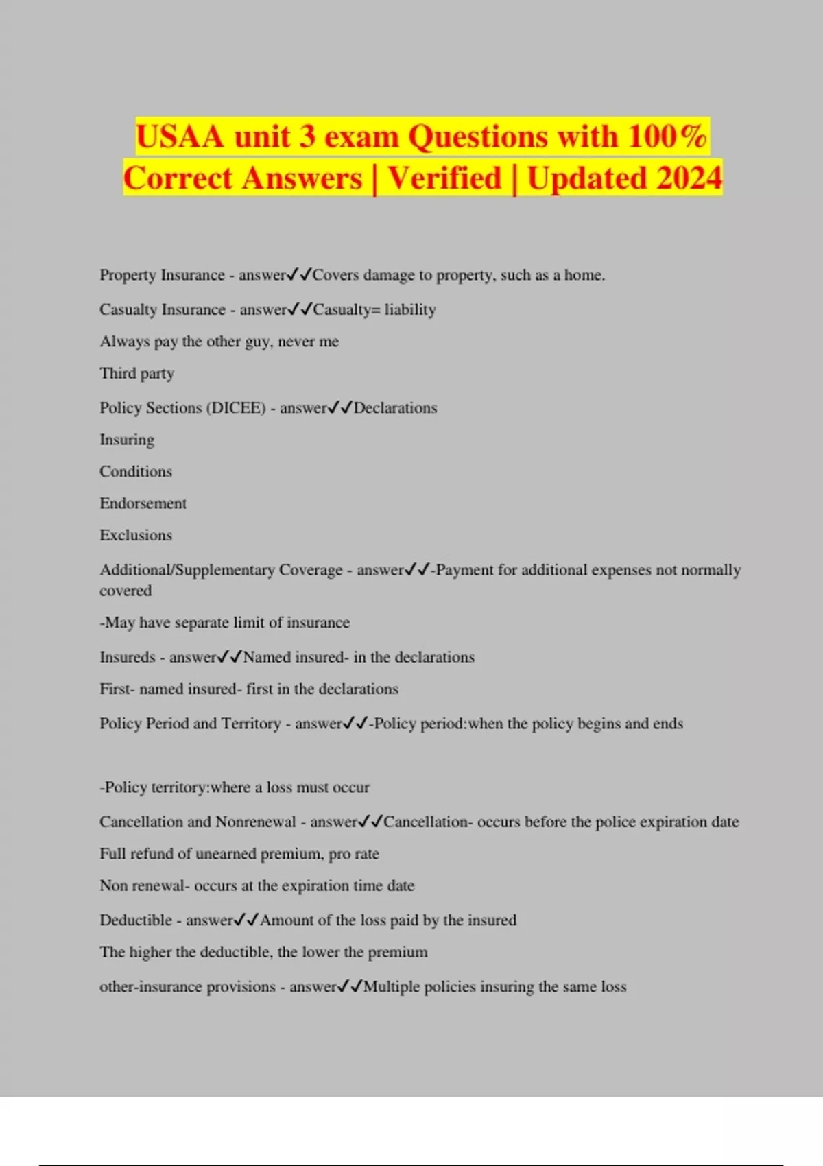 USAA unit 3 exam Questions with 100% Correct Answers | Verified | Updated 2024 Property Insurance - answerCovers damage to property, such as a home. Casualty Insurance - answerCasualty= liability Always pay the other guy, never me Third party Policy Sections (DICEE) - answerDeclarations Insuring Conditions Endorsement Exclusions Additional/Supplementary Coverage - answer-Payment for additional expenses not normally covered -May have separate limit of insurance Insureds - answerNamed insured- in the declarations First- named insured- first in the declarations Policy Period and Territory - answer-Policy period:when the policy begins and ends -Policy territory:where a loss must occur Cancellation and Nonrenewal - answerCancellation- occurs before the police expiration date Full refund of unearned premium, pro rate Non renewal- occurs at the expiration time date Deductible - answerAmount of the loss paid by the insured The higher the deductible, the lower the premium other-insurance provisions - answerMultiple policies insuring the same loss Named Insured Duties after Loss (PPC-MSP) - answerProm