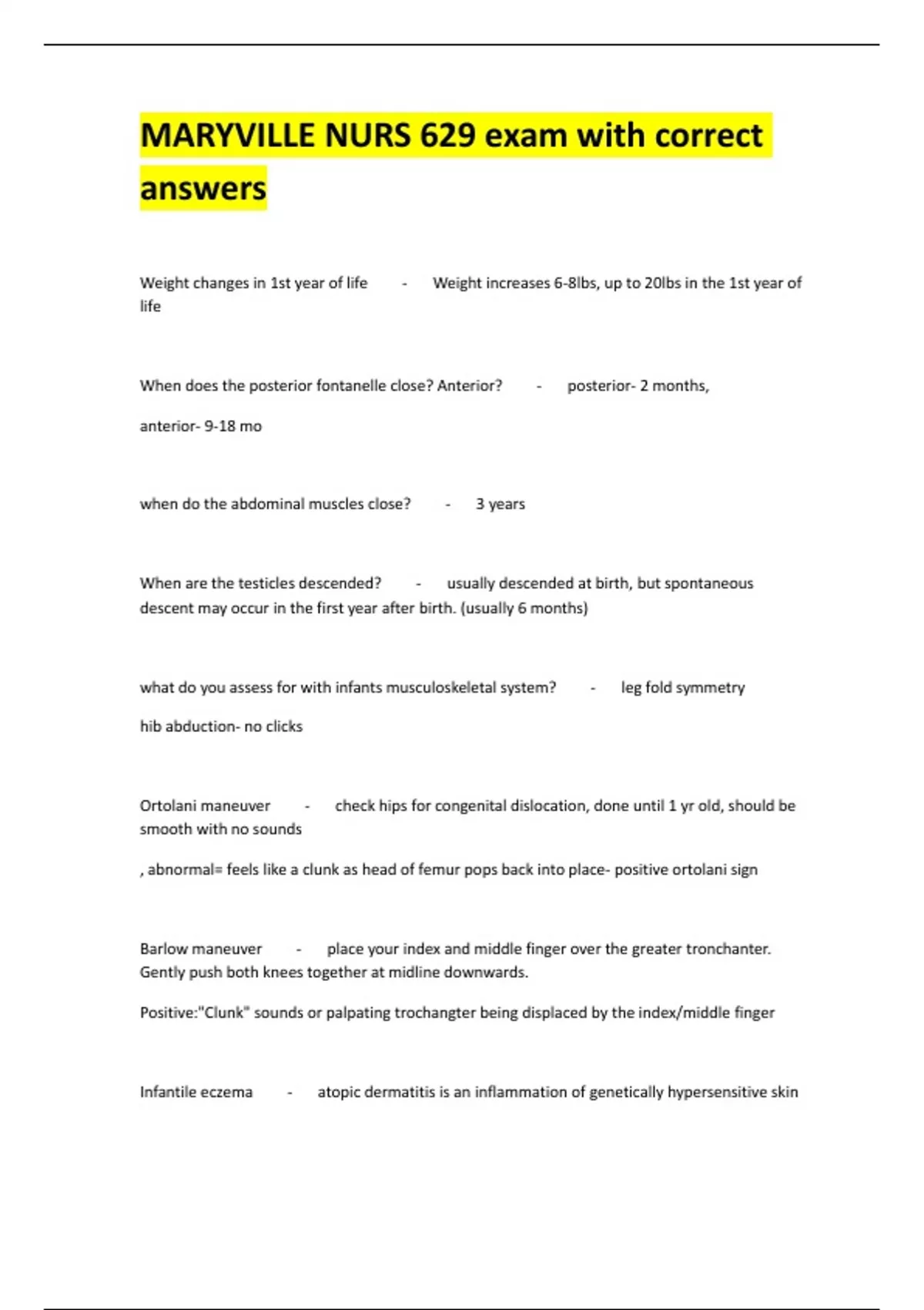 MARYVILLE NURS 629 exam with correct answers Weight changes in 1st year of life - Weight increases 6-8lbs, up to 20lbs in the 1st year of life When does the posterior fontanelle close? Anterior? - posterior- 2 months, anterior- 9-18 mo when do the abdominal muscles close? - 3 years When are the testicles descended? - usually descended at birth, but spontaneous descent may occur in the first year after birth. (usually 6 months) what do you assess for with infants musculoskeletal system? - leg fold symmetry hib abduction- no clicks Ortolani maneuver - check hips for congenital dislocation, done until 1 yr old, should be smooth with no sounds , abnormal= feels like a clunk as head of femur pops back into place- positive ortolani sign Barlow maneuver - place your index and middle finger over the greater tronchanter. Gently push both knees together at midline downwards. Positive:"Clunk" sounds or palpating trochangter being displaced by the index/middle finger Infantile eczema - atopic dermatitis is an inflammation of genetically hypersensitive skin - local vasodilation in affected areas spongiosis or breakdown of dermal cells and formation of intradermal vesicles - rarely seen in breastfed infants until they begin to eat additional food - it is a symptom rather than a disorder - infant is oversensitive to certain substances Worse in winter why is acid reflux common in infants? - their sphincters are not mature, break up feedings ~15mL, burp, then return. When does colic usually resolve? - by 6 months Toddler weight gain per year - 4-6lbs per year, grow 3 inches pe ryear In toddler always assess for? - anterior fontanel (should be closed by 18 m-2 yrs. screen for strabismus tooth eruption- if no teeth by 18 mo= xray assess for hip dysplasia, gait, bowlegged -DTRs -Babinski + (dorsiflex) normal in infant less than 24 mo