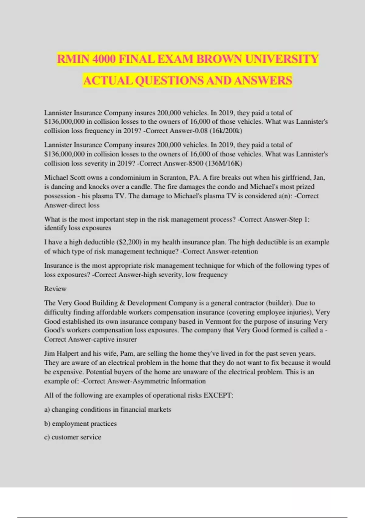 RMIN 4000 FINAL EXAM BROWN UNIVERSITY ACTUAL QUESTIONS AND ANSWERS