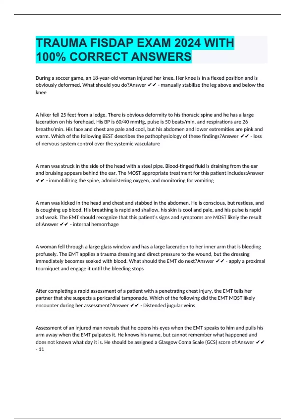 During a soccer game, an 18-year-old woman injured her knee. Her knee is in a flexed position and is obviously deformed. What should you do?Answer - manually stabilize the leg above and below the knee A hiker fell 25 feet from a ledge. There is obvious deformity to his thoracic spine and he has a large laceration on his forehead. His BP is 60/40 mmHg, pulse is 50 beats/min, and respirations are 26 breaths/min. His face and chest are pale and cool, but his abdomen and lower extremities are pink and warm. Which of the following BEST describes the pathophysiology of these findings?Answer - loss of nervous system control over the systemic vasculature A man was struck in the side of the head with a steel pipe. Blood-tinged fluid is draining from the ear and bruising appears behind the ear. The MOST appropriate treatment for this patient includes:Answer - immobilizing the spine, administering oxygen, and monitoring for vomiting A man was kicked in the head and chest and stabbed in the abdomen. He is conscious, but restless, and is coughing up blood. His breathing is rapid and shallow, his skin is cool and pale, and his pulse is rapid and weak. The EMT should recognize that this patient's signs and symptoms are MOST likely the result of:Answer - internal hemorrhage A woman fell through a large glass window and has a large laceration to her inner arm that is bleeding profusely. The EMT applies a trauma dressing and direct pressure to the wound, but the dressing immediately becomes soaked with blood. What should the EMT do next?Answer - apply a proximal tourniquet and engage it until the bleeding stops After completing a rapid assessment of a patient with a penetrating chest injury, the EMT tells her partner that she suspects a pericardial tamponade. Which of the following did the EMT MOST likely encounter during her assessment?Answer - Distended jugular veins Assessme