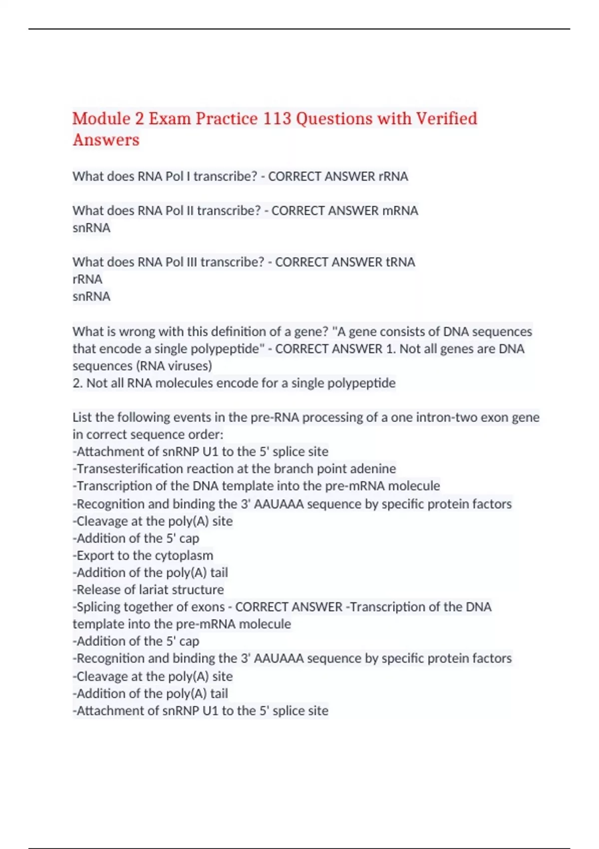 Module 2 Exam Practice 113 Questions with Verified Answers What does RNA Pol I transcribe? - CORRECT ANSWER rRNA What does RNA Pol II transcribe? - CORRECT ANSWER mRNA snRNA What does RNA Pol III transcribe? - CORRECT ANSWER tRNA rRNA snRNA What is wrong with this definition of a gene? "A gene consists of DNA sequences that encode a single polypeptide" - CORRECT ANSWER 1. Not all genes are DNA sequences (RNA viruses) 2. Not all RNA molecules encode for a single polypeptide List the following events in the pre-RNA processing of a one intron-two exon gene in correct sequence order: -Attachment of snRNP U1 to the 5' splice site -Transesterification reaction at the branch point adenine -Transcription of the DNA template into the pre-mRNA molecule -Recognition and binding the 3' AAUAAA sequence by specific protein factors -Cleavage at the poly(A) site -Addition of the 5' cap -Export to the cytoplasm -Addition of the poly(A) tail -Release of lariat structure -Splicing together of exons - CORRECT ANSWER -Transcription of the DNA template into the pre-mRNA molecule -Addition of the 5' cap -Recognition and binding the 3' AAUAAA sequence by specific protein factors -Cleavage at the poly(A) site -Addition of the poly(A) tail -Attachment of snRNP U1 to the 5' splice site -Transesterification reaction at the branch point adenine -Release of lariat structure -Splicing together of exons -Export to the cytoplasm What is meant by the term exon shuffling? - CORRECT ANSWER The functional regions of genes in eukaryotes consist of collections of exons originally present in ancestral genes that are brought together through various recombination events over time. Briefly define transformation and describe the relationship between the phenomenon of transformation and the discovery that DNA is the genetic material in bacteria. - CORRECT ANSWER Transformation is the process whereby one organism is genetically altered by exposure to DNA from another organism. Since DNA can carry heritable "traits" from one organism to another, it must be the genetic material. The finding that virtually all organisms use the same genetic code provides the basis for declaring that the code is universal. Name one exception to such universality. - CORRECT ANSWER the use of codon UGA to code for tryptophan instead of termination in human and yeast mitochondrial DNA Supercoiling caused by unwinding of the dsDNA molecule is relieved by what enzyme? - CORRECT ANSWER DNA gyrase In eukaryotic replication, there is another fundamental level of complexity because of what proteins? - CORRECT ANSWER histones This molecule is synthesized using nucleotides containing the bases adenine, guanine, cytosine, and uracil. a. RNA only b. DNA only c. both RNA and DNA d. neither RNA nor DNA - CORRECT ANSWER A What does it mean to say that double-stranded nucleic acids are antiparallel? - CORRECT ANSWER The C-5' to C-3' orientations run in opposite directions. List 3 requirements of any substance that is "genetic material" - CORRECT ANSWER Replication Expression Variation by mutation List the components of a nucleosome. Be sure to list specific protein, not just protein type. - CORRECT ANSWER Composed of two turns of DNA wrapped around a set of 8 proteins called histones. Each histone is composed of two copies of each of the histone proteins H2A, H2B, H3, and H4 What is the name of the replication unit in prokaryotes, and how does it differ in eukaryotes? - CORRECT ANSWER Replicon. Prokaryotes have one and eukaryotes have many This method of replication preserves the covalent links on one strand of DNA but allows permanent separation of the "parental" double helix to form two templates. - CORRECT ANSWER semiconservative replication What are the two major components of the Tobacco Mosaic Virus? - CORRECT ANSWER RNA and protein The genetic code is fairly consistent among all organisms. The term often used to describe such consistency in the code is - CORRECT ANSWER Universal What is the function of the TATA binding protein? - CORRECT ANSWER Allows eukaryotic RNA polymerase II to bind to the promoter of genes How do centromeres help control the cell cycle? - CORRECT ANSWER by inhibiting anaphase until spindle fibers are attached to chromosomes What is the function of eukaryotic RNA polymerase I? - CORRECT ANSWER transcription of rRNA genes When scientists were attempting to determine the structure of the genetic code, Crick and co-workers found that when three base additions or three base deletions occurred in a single gene, the wild-type phenotype was sometimes restored. These data supported the hypothesis that - CORRECT ANSWER the code is triplet Which of the following clusters of terms accurately describes DNA as it is generally viewed to exist in prokaryotes and eukaryotes? - CORRECT ANSWER double-stranded, antiparallel, (A + T)/C + G) = variable, (A + G)/(C+ T) = 1.0 The β chain of adult hemoglobin is composed of 146 amino acids of a known sequence. In comparing the normal β chain with the β chain in sickle cell hemoglobin, what alteration is one likely to find? - CORRECT ANSWER valine instead of glutamic acid in the sixth position The primary structure of a protein is determined by - CORRECT ANSWER the sequence of amino acids The one-gene, one-enzyme hypothesis emerged from work on which two organisms? - CORRECT ANSWER Neurospora and Drosophila Which enzyme catalyzes the elongation of a DNA strand in the 5' → 3' direction? - CORRECT ANSWER DNA polymerase III DNA polymerase I is thought to add nucleotides - CORRECT ANSWER in the place of the primer RNA after it is removed That some organisms contain much larger amounts of DNA than are apparently "needed" and that some relatively closely related organisms may have vastly different amounts of DNA is more typical in - CORRECT ANSWER eukaryotes than in prokaryotes. Which of the following statements best describes the messenger RNA? -mRNA is synthesized by ribosomes in the endoplasmatic reticulum -geneti