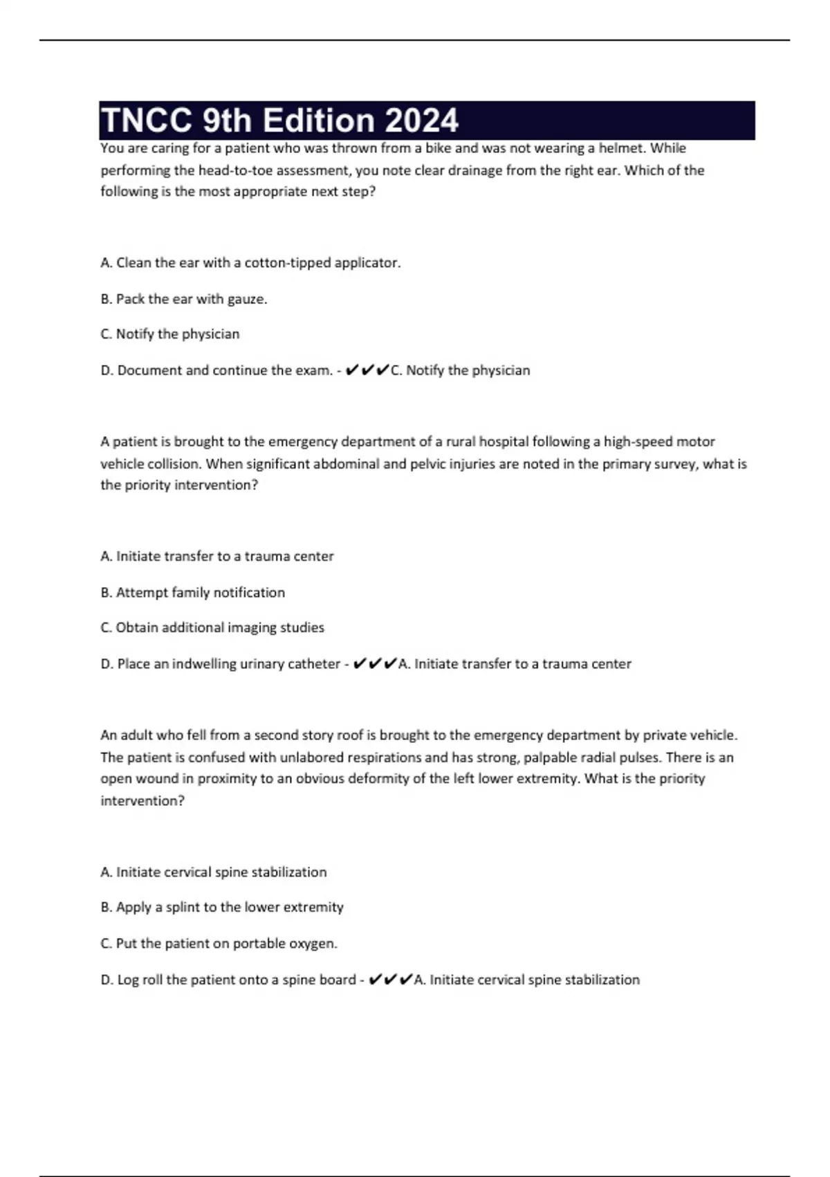 You are caring for a patient who was thrown from a bike and was not wearing a helmet. While performing the head-to-toe assessment, you note clear drainage from the right ear. Which of the following is the most appropriate next step? A. Clean the ear with a cotton-tipped applicator. B. Pack the ear with gauze. C. Notify the physician D. Document and continue the exam. - C. Notify the physician A patient is brought to the emergency department of a rural hospital following a high-speed motor vehicle collision. When significant abdominal and pelvic injuries are noted in the primary survey, what is the priority intervention? A. Initiate transfer to a trauma center B. Attempt family notification C. Obtain additional imaging studies D. Place an indwelling urinary catheter - A. Initiate transfer to a trauma center An adult who fell from a second story roof is brought to the emergency department by private vehicle. The patient is confused with unlabored respirations and has strong, palpable radial pulses. There is an open wound in proximity to an obvious deformity of the left lower extremity. What is the priority intervention? A. Initiate cervical spine stabilization B. Apply a splint to the lower extremity C. Put the patient on portable oxygen. D. Log roll the patient onto a spine board - A. Initiate cervical spine stabilization