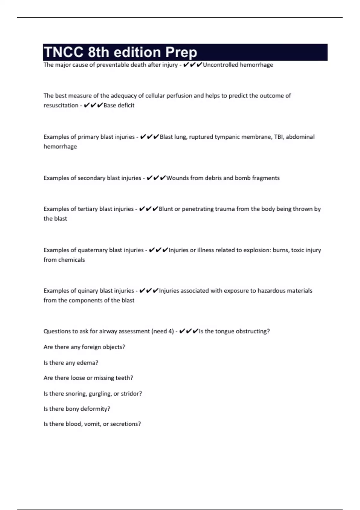 The major cause of preventable death after injury - Uncontrolled hemorrhage The best measure of the adequacy of cellular perfusion and helps to predict the outcome of resuscitation - Base deficit Examples of primary blast injuries - Blast lung, ruptured tympanic membrane, TBI, abdominal hemorrhage Examples of secondary blast injuries - Wounds from debris and bomb fragments Examples of tertiary blast injuries - Blunt or penetrating trauma from the body being thrown by the blast Examples of quaternary blast injuries - Injuries or illness related to explosion: burns, toxic injury from chemicals Examples of quinary blast injuries - Injuries associated with exposure to hazardous materials from the components of the blast Questions to ask for airway assessment (need 4) - Is the tongue obstructing? Are there any foreign objects? Is there any edema? Are there loose or missing teeth? Is there snoring, gurgling, or stridor? Is there bony deformity? Is there blood, vomit, or secretions?