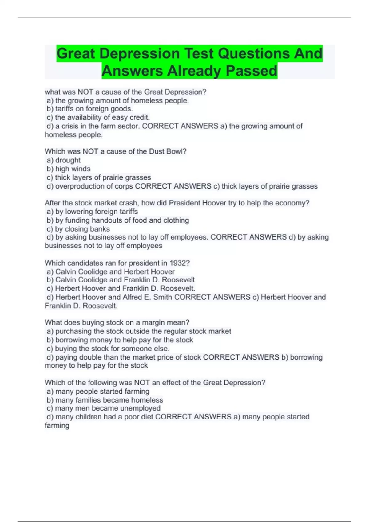 Great Depression Test Questions And Answers Already Passed