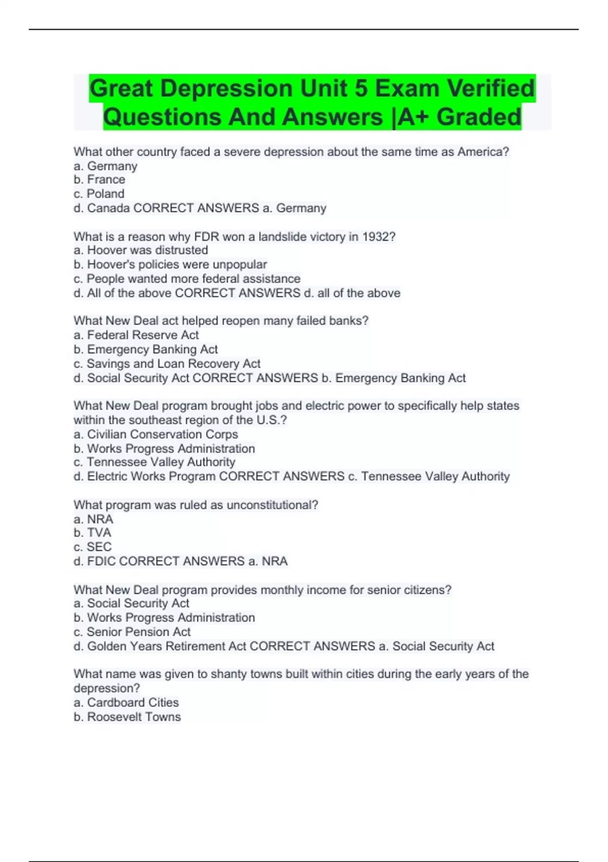 Great Depression Unit 5 Exam Verified Questions And Answers |A+ Graded