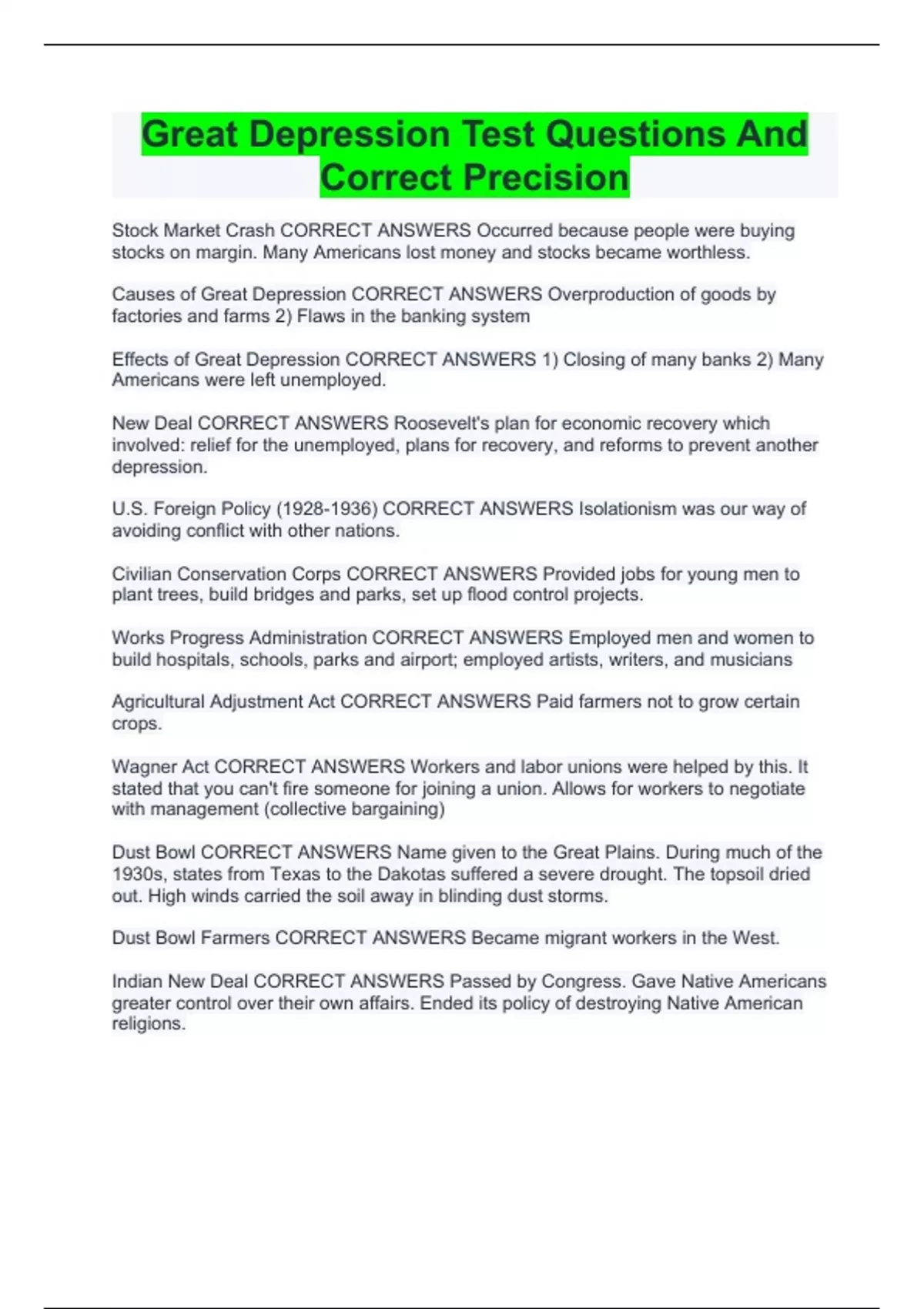 Great Depression Test Questions And Correct Precision