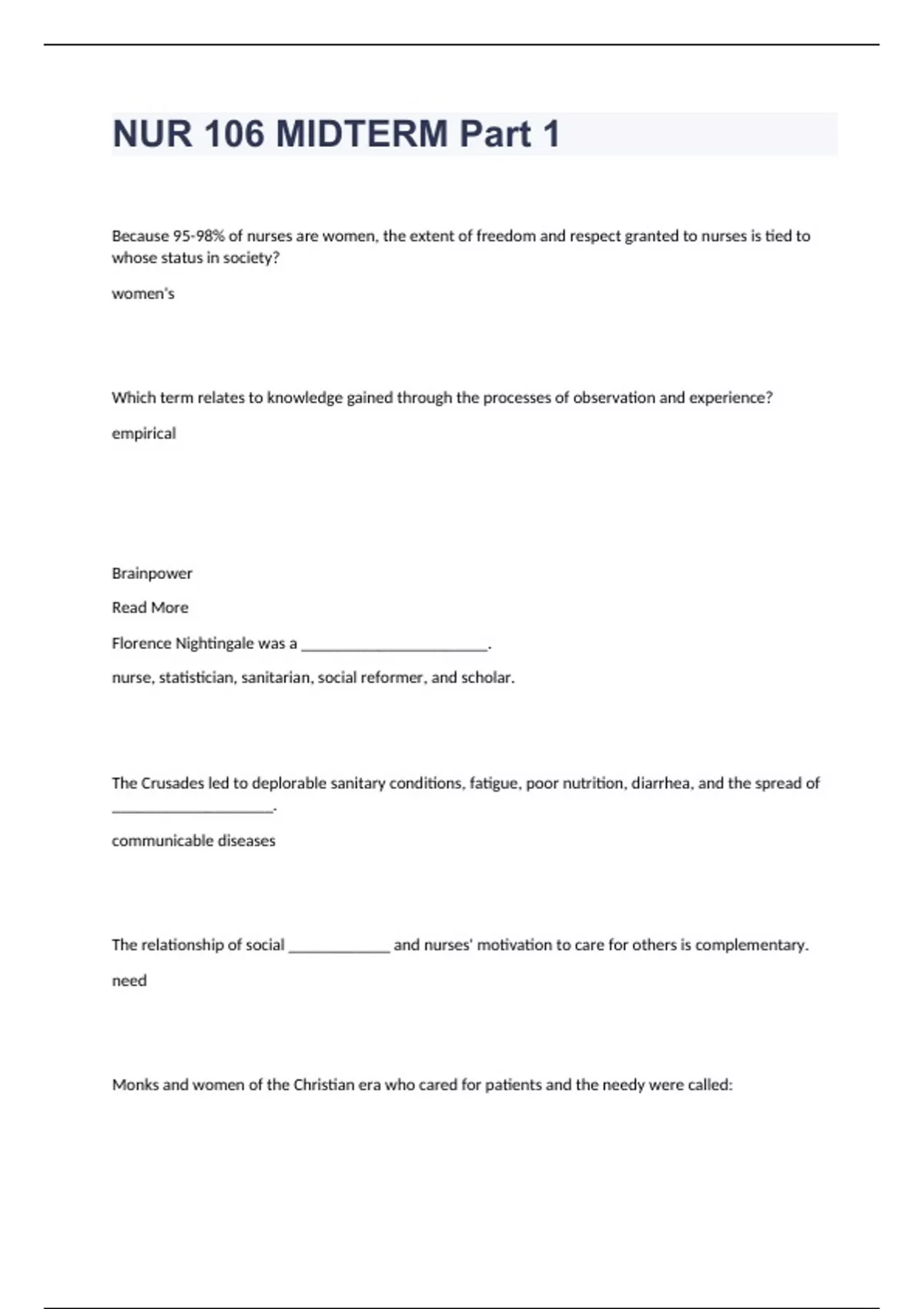 NUR 106 MIDTERM Part 1 Question and answers correctly solved 2023/2024 Because 95-98% of nurses are women, the extent of freedom and respect granted to nurses is tied to whose status in society? women's Which term relates to knowledge gained through the processes of observation and experience? empirical Brainpower Read More Florence Nightingale was a ______________________. nurse, statistician, sanitarian, social reformer, and scholar. The Crusades led to deplorable sanitary conditions, fatigue, poor nutrition, diarrhea, and the spread of ___________________. communicable diseas