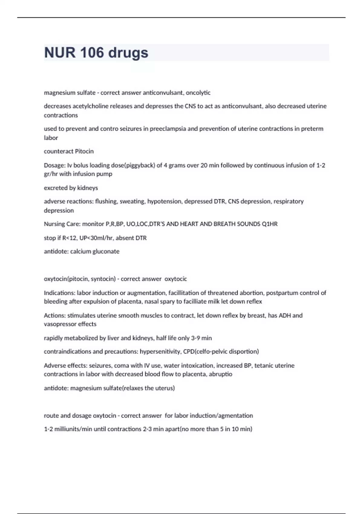 NUR 106 drugs Question and answers 2023/2024 verified to passmagnesium sulfate - correct answer anticonvulsant, oncolytic decreases acetylcholine releases and depresses the CNS to act as anticonvulsant, also decreased uterine contractions used to prevent and contro seizures in preeclampsia and prevention of uterine contractions in preterm labor counteract Pitocin Dosage: Iv bolus loading dose(piggyback) of 4 grams over 20 min followed by continuous infusion of 1-2 gr/hr with infusion pump excreted by kidneys adverse reactions: flushing, sweating, hypotension, depressed DTR, CNS depression, respiratory depression Nursing Care: monitor P,R,BP, UO,LOC,DTR'S AND HEART AND BREATH SOUNDS Q1HR stop if R<12, UP<30ml/hr, absent DTR antidote: calcium gluconate oxytocin(pitocin, syntocin) - correct answer oxytocic Indications: labor induction or augmentation, facillitation of threatened abortion, postpartum control of bleeding after expulsion of placenta, nasal spary to facilliate milk let down reflex Actions: stimulates uterine smooth muscles to contract, let down reflex by breast, has ADH and vasopressor effects rapidly metabolized by liver and kidneys, half life only 3-9 min contraindications and precautions: hypersenitivity, CPD(celfo-pelvic disportion) Adverse effects: seizures, coma with IV use, water intoxication, increased BP, tetanic uterine contractions in labor with decreased blood flow to placenta, abruptio antidote: magnesium sulfate(relaxes the uterus) route and dosage oxytocin - correct answer for labor induction/agmentation 1-2 milliunits/min until co