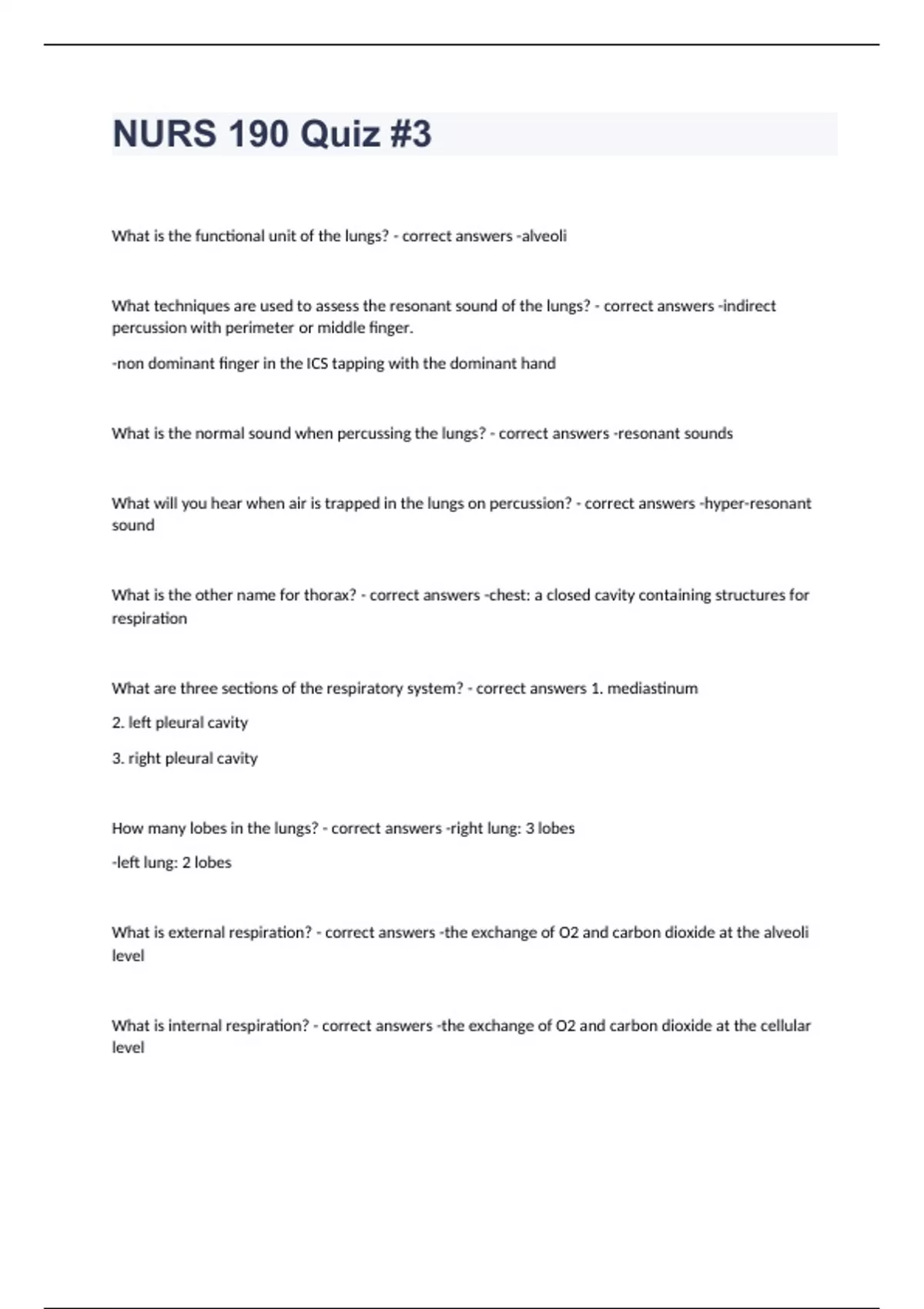 NURS 190 Quiz #3 Question and answers 2023/2024 verified to passWhat is the functional unit of the lungs? - correct answers -alveoli What techniques are used to assess the resonant sound of the lungs? - correct answers -indirect percussion with perimeter or middle finger. -non dominant finger in the ICS tapping with the dominant hand What is the normal sound when percussing the lungs? - correct answers -resonant sounds What will you hear when air is trapped in the lungs on percussion? - correct answers -hyper-resonant sound What is the other name for thorax? - correct answers -chest: a closed cavity containing structures for respiration What are three sections of the respiratory system? - correct answers 1. mediastinum 2. left pleural cavity 3. right pleural cavity