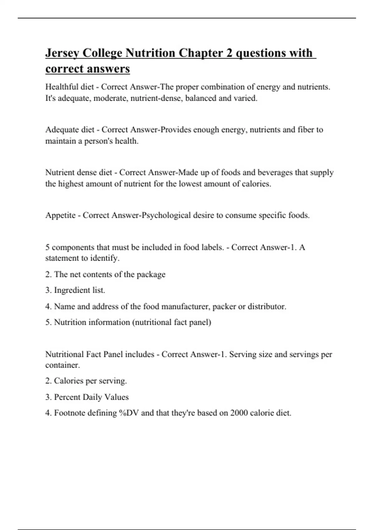 Healthful diet - Correct Answer-The proper combination of energy and nutrients. It's adequate, moderate, nutrient-dense, balanced and varied. Adequate diet - Correct Answer-Provides enough energy, nutrients and fiber to maintain a person's health. Nutrient dense diet - Correct Answer-Made up of foods and beverages that supply the highest amount of nutrient for the lowest amount of calories. Appetite - Correct Answer-Psychological desire to consume specific foods. 5 components that must be included in food labels. - Correct Answer-1. A statement to identify. 2. The net contents of the package 3. Ingredient list. 4. Name and address of the food manufacturer, packer or distributor. 5. Nutrition information (nutritional fact panel) Nutritional Fact Panel includes - Correct Answer-1. Serving size and servings per container. 2. Calories per serving.