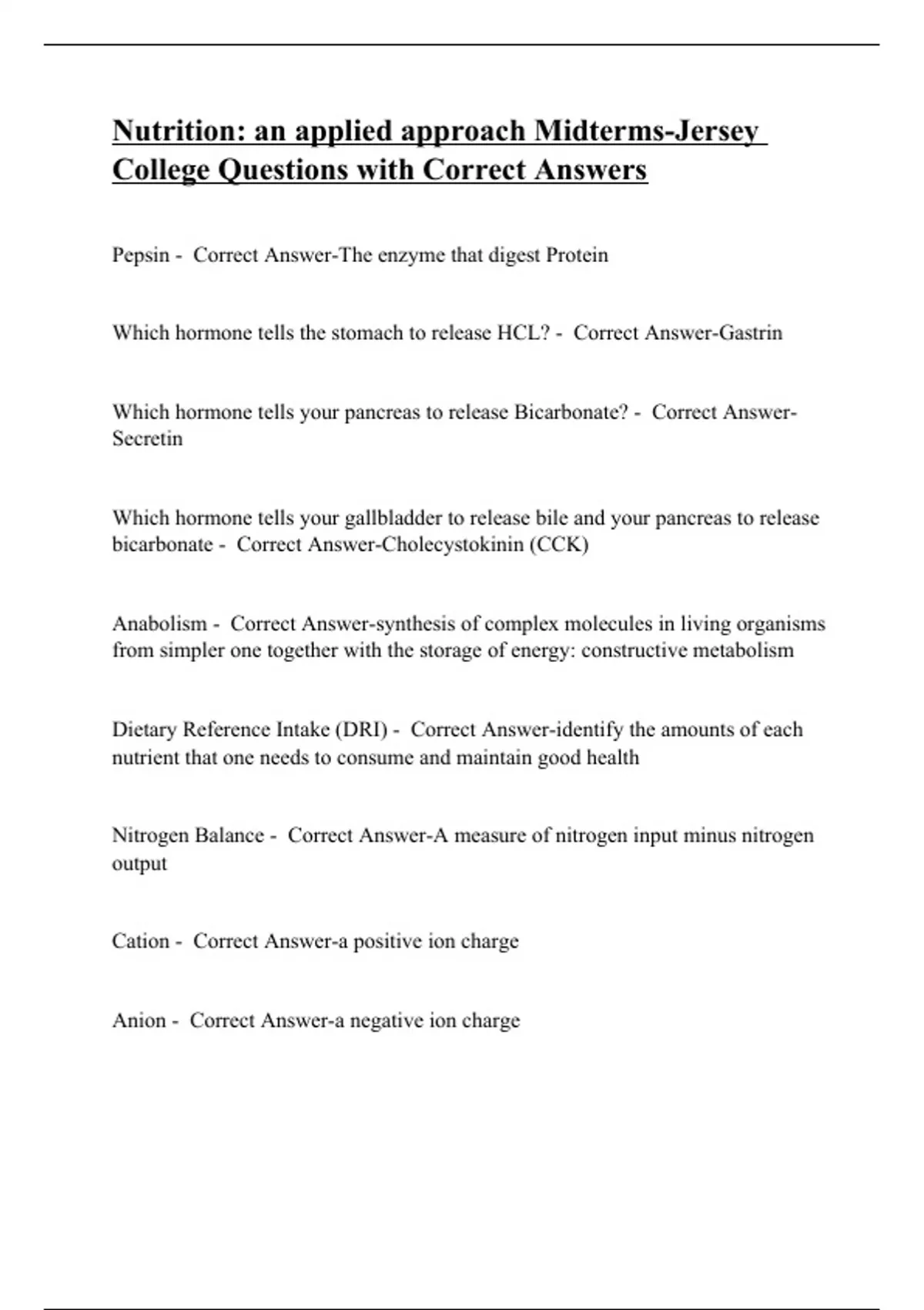 Nutrition: an applied approach Midterms-Jersey College Questions with Correct Answers