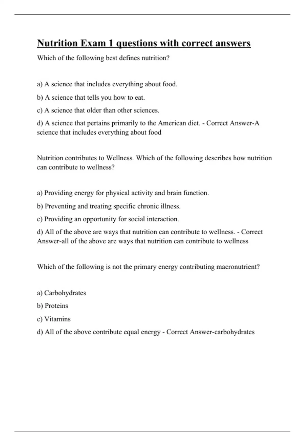 Which of the following best defines nutrition? a) A science that includes everything about food. b) A science that tells you how to eat. c) A science that older than other sciences. d) A science that pertains primarily to the American diet. - Correct Answer-A science that includes everything about food Nutrition contributes to Wellness. Which of the following describes how nutrition can contribute to wellness? a) Providing energy for physical activity and brain function. b) Preventing and treating specific chronic illness. c) Providing an opportunity for social interaction. d) All of the above are ways that nutrition can contribute to wellness. - Correct Answer-all of the above are ways that nutrition can contribute to wellness Which of the following is not the primary energy contributing macronutrient? a) Carbohydrates