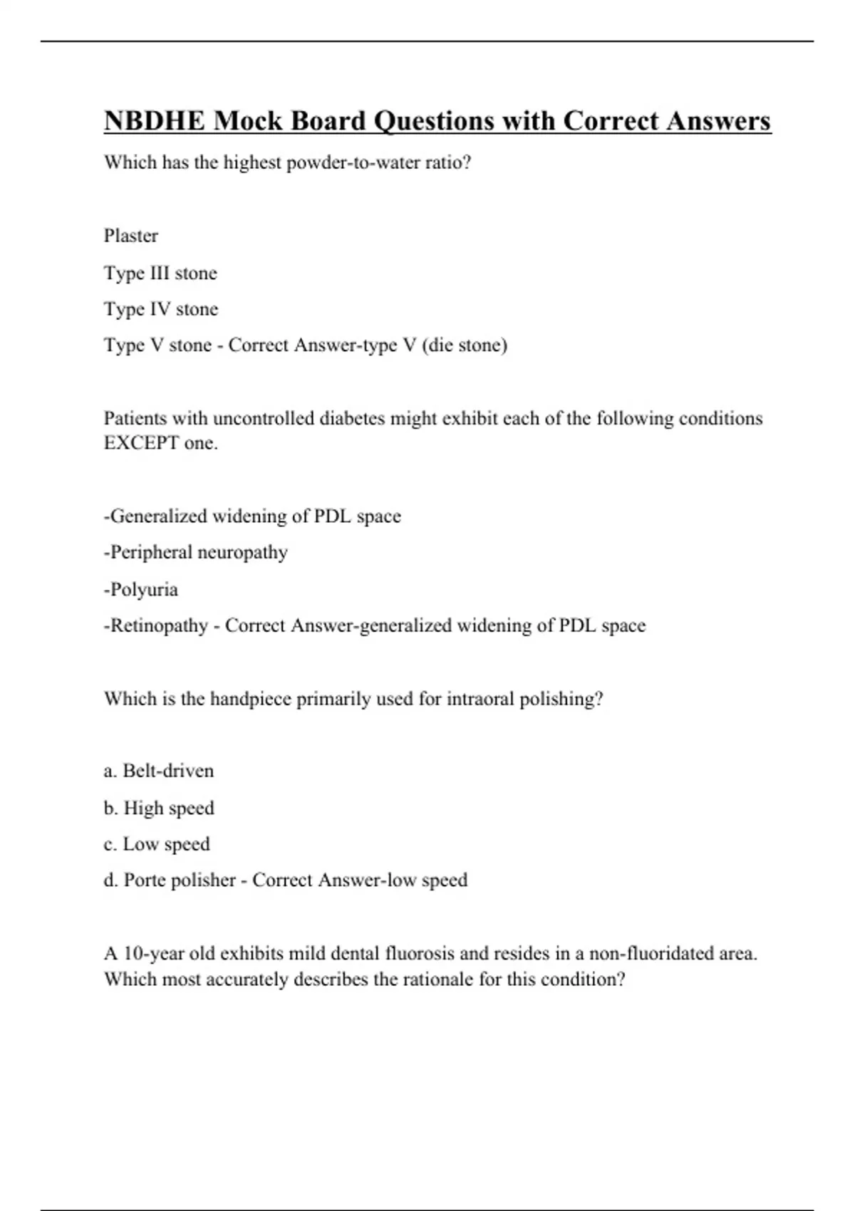 Which has the highest powder-to-water ratio? Plaster Type III stone Type IV stone Type V stone - Correct Answer-type V (die stone) Patients with uncontrolled diabetes might exhibit each of the following conditions EXCEPT one. -Generalized widening of PDL space -Peripheral neuropathy -Polyuria -Retinopathy - Correct Answer-generalized widening of PDL space Which is the handpiece primarily used for intraoral polishing? a. Belt-driven b. High speed c. Low speed d. Porte polisher - Correct Answer-low speed A 10-year old exhibits mild dental fluorosis and resides in a non-fluoridated area. Which most accurately describes the rationale for this condition? a. Received professionally applied f