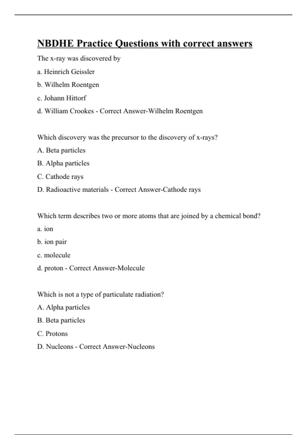 The x-ray was discovered by a. Heinrich Geissler b. Wilhelm Roentgen c. Johann Hittorf d. William Crookes - Correct Answer-Wilhelm Roentgen Which discovery was the precursor to the discovery of x-rays? A. Beta particles B. Alpha particles C. Cathode rays D. Radioactive materials - Correct Answer-Cathode rays Which term describes two or more atoms that are joined by a chemical bond? a. ion b. ion pair c. molecule d. proton - Correct Answer-Molecule Which is not a type of particulate radiation? A. Alpha particles B. Beta particles C. Protons D. Nucleons - Correct Answer-Nucleons Which is the location where x-r