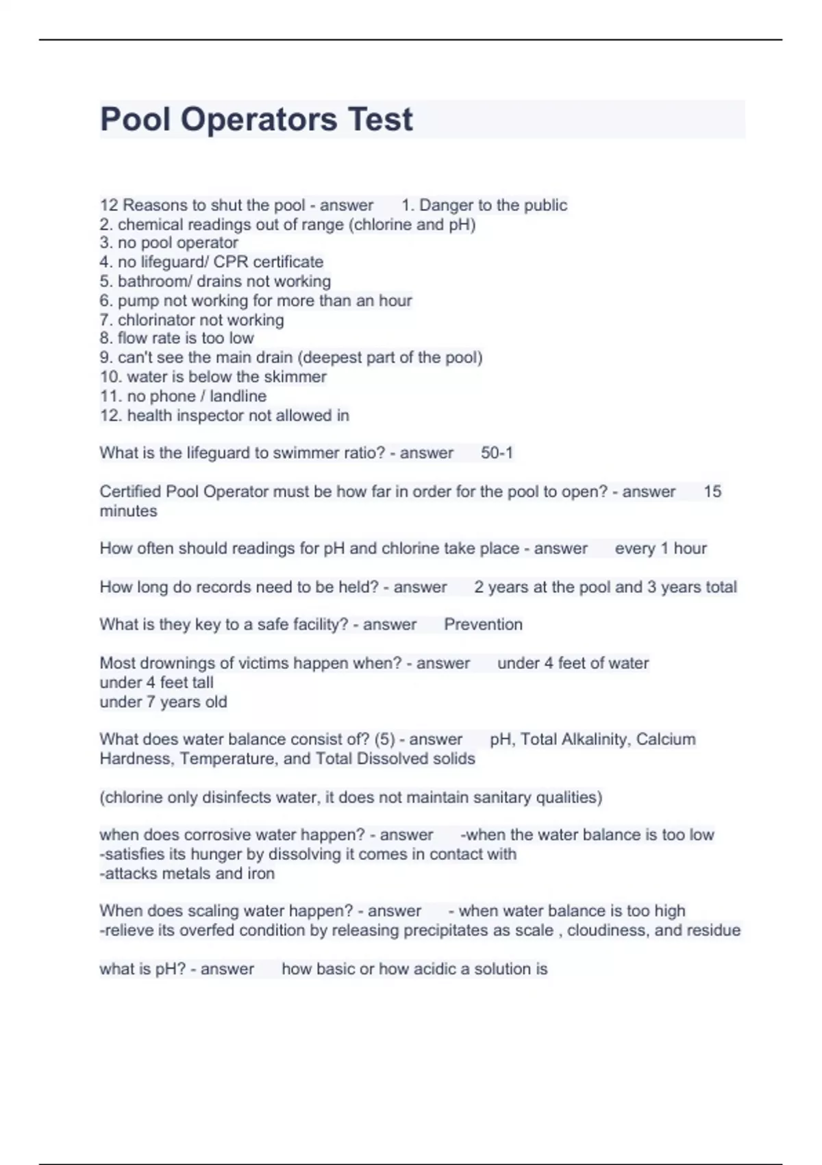 Exam of 7 pages for the course pool operator at pool operator (Pool Operators Test)