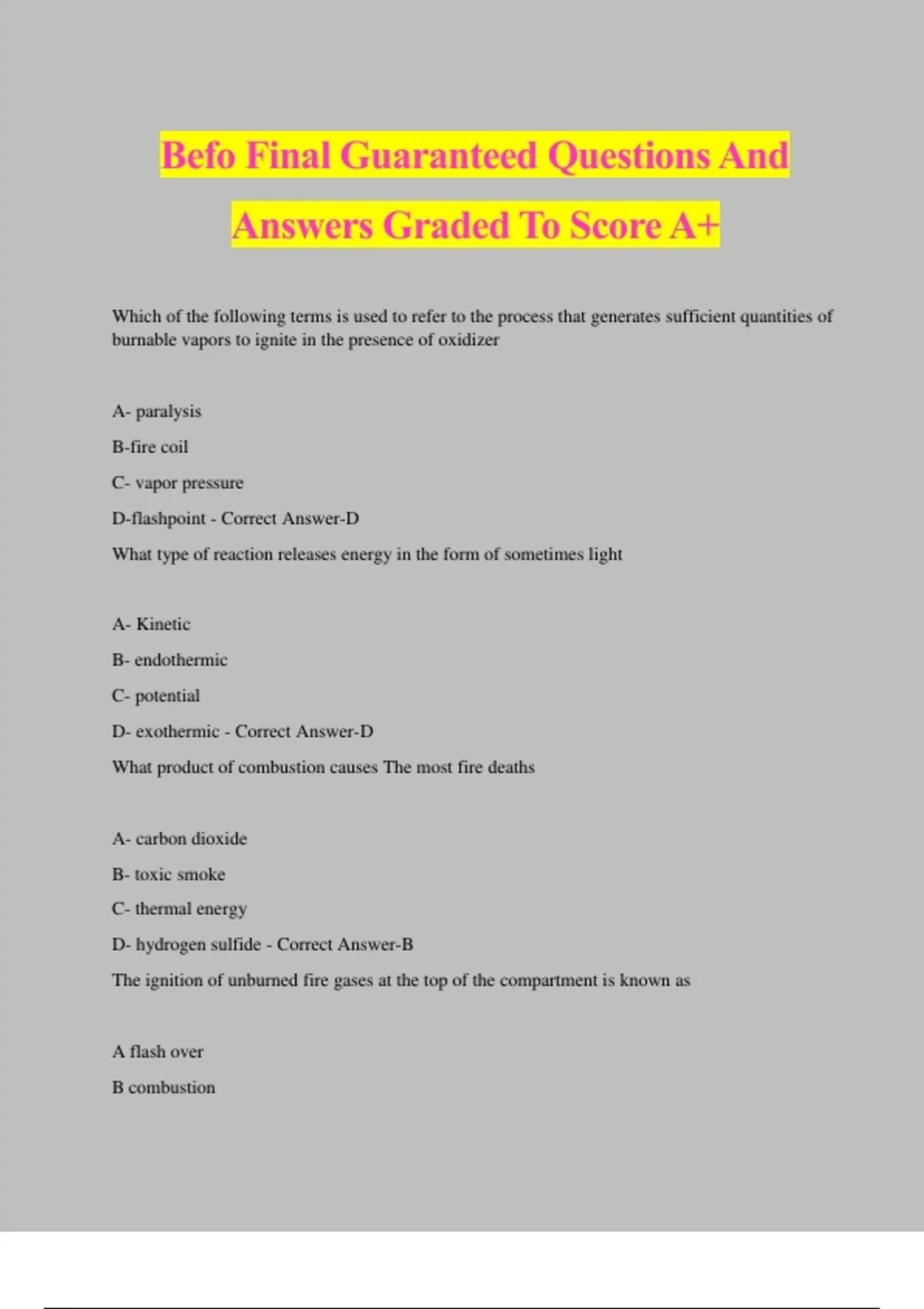 Befo Final Guaranteed Questions And Answers Graded To Score A+ Which of the following terms is used to refer to the process that generates sufficient quantities of burnable vapors to ignite in the presence of oxidizer A- paralysis B-fire coil C- vapor pressure D-flashpoint - Correct Answer-D What type of reaction releases energy in the form of sometimes light A- Kinetic B- endothermic C- potential D- exothermic - Correct Answer-D What product of combustion causes The most fire deaths A- carbon dioxide B- toxic smoke C- thermal energy D- hydrogen sulfide - Correct Answer-B The ignition of unburned fire gases at the top of the compartment is known as A flash over B combustion C roll over D smoke explosion - Correct Answer-C The potential chemical energy in fuel in fire behavior Is converted to A mechanical energy B thermal energy C electrical energy D sound energy - Correct Answer-B The male threads on fire hydrant discharge outlets must A- be connected to a 12 inch water main B- Conform to those used by neighboring jurisdictions C- be the ones used by the local fire department D- have a 6 inch outlet - Correct Answer-C Fire hydrant markings can be used to designate A-flow capacities B-Distance from the next hydrant C-Typical water pressure D- Distance from nearest fire department - Correct Answer-A What kind of fire hydrants are designed for use in climates that have freezing temperatures A-cold-weather hydrant B-dry barrel hydrant C-Wet barrel hydrants D-warm weather hydrants - Correct Answer-B Which means of moving water is used by most communities? A -Combination system