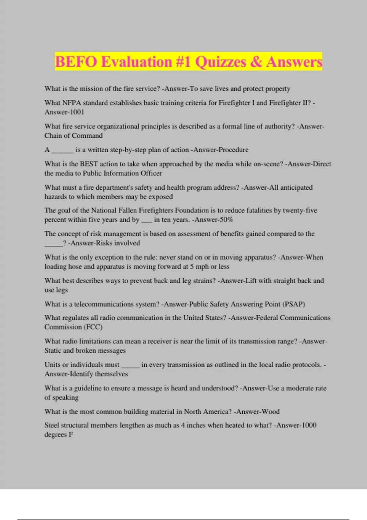 BEFO Evaluation #1 Quizzes & Answers What is the mission of the fire service? -Answer-To save lives and protect property What NFPA standard establishes basic training criteria for Firefighter I and Firefighter II? - Answer-1001 What fire service organizational principles is described as a formal line of authority? -Answer- Chain of Command A ______ is a written step-by-step plan of action -Answer-Procedure What is the BEST action to take when approached by the media while on-scene? -Answer-Direct the media to Public Information Officer What must a fire department's safety and health program address? -Answer-All anticipated hazards to which members may be exposed The goal of the National Fallen Firefighters Foundation is to reduce fatalities by twenty-five percent within five years and by ___ in ten years. -Answer-50% The concept of risk management is based on assessment of benefits gained compared to the _____? -Answer-Risks involved What is the only exception to the rule: never stand on or in moving apparatus? -Answer-When loading hose and apparatus is moving forward at 5 mph or less What best describes ways to prevent back and leg strains? -Answer-Lift with straight back and use legs What is a telecommunications system? -Answer-Public Safety Answering Point (PSAP) What regulates all radio communication in the United States? -Answer-Federal Communications Commission (FCC)