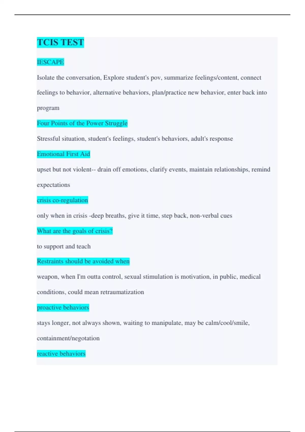 TCIS TEST IESCAPE Isolate the conversation, Explore student's pov, summarize feelings/content, connect feelings to behavior, alternative behaviors, plan/practice new behavior, enter back into program Four Points of the Power Struggle Stressful situation, student's feelings, student's behaviors, adult's response Emotional First Aid upset but not violent-- drain off emotions, clarify events, maintain relationships, remind expectations crisis co-regulation only when in crisis -deep breaths, give it time, step back, non-verbal cues What are the goals of crisis? to support and teach Restraints should be avoided when weapon, when I'm outta control, sexual stimulation is motivation, in public, medical conditions, could mean retraumatization proactive behaviors