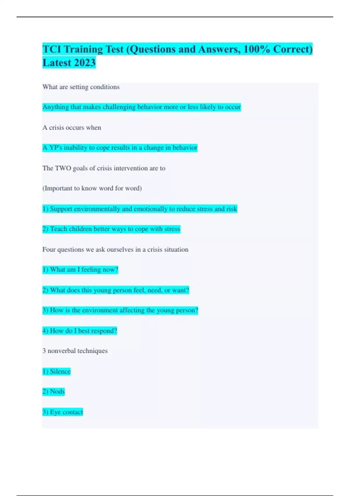 TCI Training Test (Questions and Answers, 100% Correct) Latest 2023 What are setting conditions Anything that makes challenging behavior more or less likely to occur A crisis occurs when A YP's inability to cope results in a change in behavior The TWO goals of crisis intervention are to (Important to know word for word) 1) Support environmentally and emotionally to reduce stress and risk 2) Teach children better ways to cope with stress Four questions we ask ourselves in a crisis situation 1) What am I feeling now? 2) What does this young person feel, need, or want? 3) How is the environment affecting the young person? 4) How do I best respond? 3 nonverbal techniques 1) Silence 2) Nods 3) Eye contact