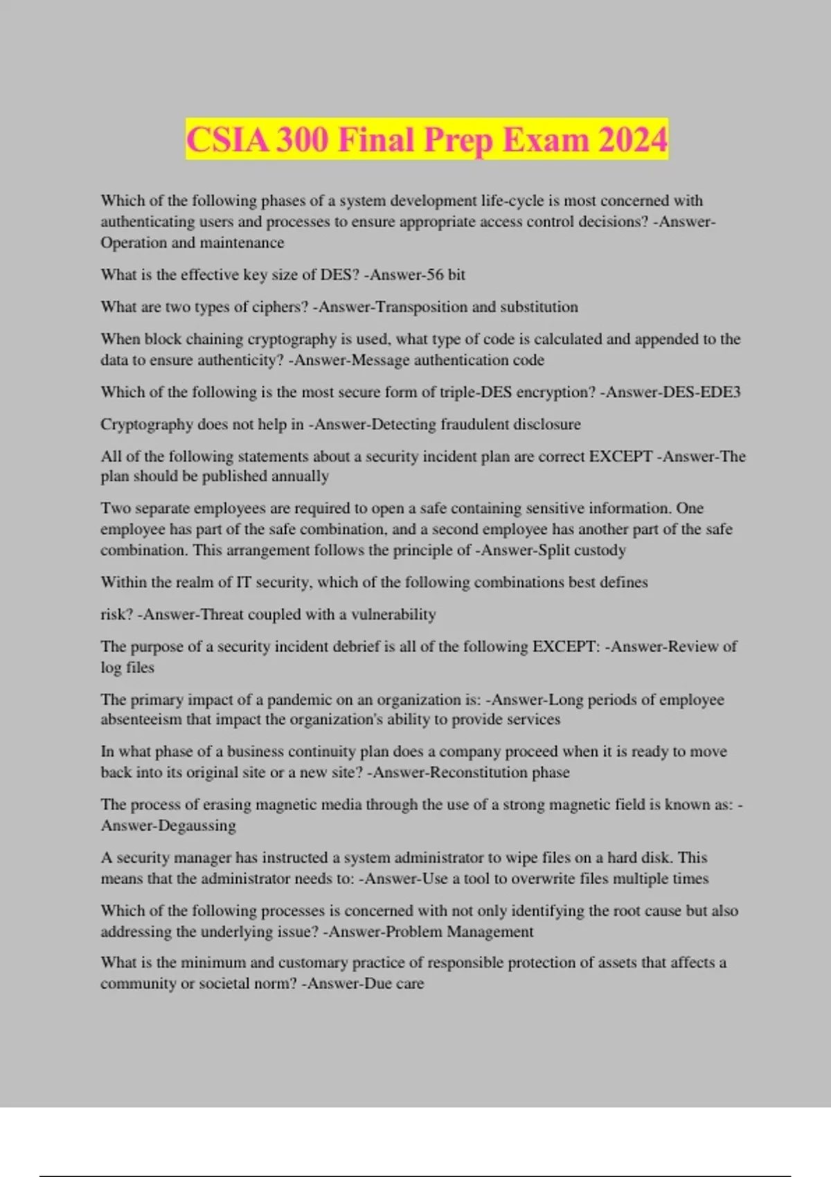 CSIA 300 Final Prep Exam 2024 Which of the following phases of a system development life-cycle is most concerned with authenticating users and processes to ensure appropriate access control decisions? -Answer- Operation and maintenance What is the effective key size of DES? -Answer-56 bit What are two types of ciphers? -Answer-Transposition and substitution When block chaining cryptography is used, what type of code is calculated and appended to the data to ensure authenticity? -Answer-Message authentication code Which of the following is the most secure form of triple-DES encryption? -Answer-DES-EDE3 Cryptography does not help in -Answer-Detecting fraudulent disclosure All of the following statements about a security incident plan are correct EXCEPT -Answer-The plan should be published annually Two separate employees are required to open a safe containing sensitive information. One employee has part of the safe combination, and a second employee has another part of the safe combination. This arrangement follows the principle of -Answer-Split custody Within the realm of IT security, which of the following combinations best defines risk? -Answer-Threat coupled with a vulnerability The purpose of a security incident debrief is all of the following EXCEPT: -Answer-Review of log files The primary impact of a pandemic on an organization is: -Answer-Long periods of employee absenteeism that impact the organization's ability to provide services In what phase of a business continuity plan does a company proceed when it is ready to move back into its original site or a new site? -Answer-Reconstitution phase The process of erasing magnetic media through the use of a strong magnetic field is known as: - Answer-Degaussing A security manager has instructed a system administrator to wipe files on a hard disk. This means that the administrator needs to: -Answer-Use a tool to overwrite files multiple times Which of the following processes is concerned with not only identifying the root cause but also addressing the underlying issue? -Answer-Problem Management What is the minimum and customary practice of responsible protection of assets that affects a community or societal norm? -Answer-Due care What is one disadvantage of content-dependent protection of information? -Answer-increases processing overhead In the event of a security incident, one of the primary objectives of the operations staff is to ensure that.. -Answer-there is minimal disruption to the organization's mission Which of the following statements pertaining to block ciphers is incorrect? -Answer-Plain text is encrypted with a public key and decrypted with a private key. Cryptography does not help in: -Answer-Detecting fraudulent disclosure Where is firmware primarily stored on a computer system? -Answer-Read-only memory What size is an MD5 message digest (hash)? -Answer-128 bits Which of the following mail standards relies on a "Web of Trust" ? -Answer-Pretty Good Privacy (PGP How many bits is the effective length of the key of the Data Encryption Standard Algorithm? - Answer-56 A demilitarized zone on a computer network exists for all of the following reasons except: - Answer-Reduces the load on firewalls The primary advantage of the use of a central management console for anti-virus is: -Answer- Consolidation of reporting and centralized signature file distribution Which attack is primarily based on the fragmentation implementation of IP and uses large ICMP packets? -Answer-Ping of Death TCP and UDP use port numbers of what length? -Answer-16 bit