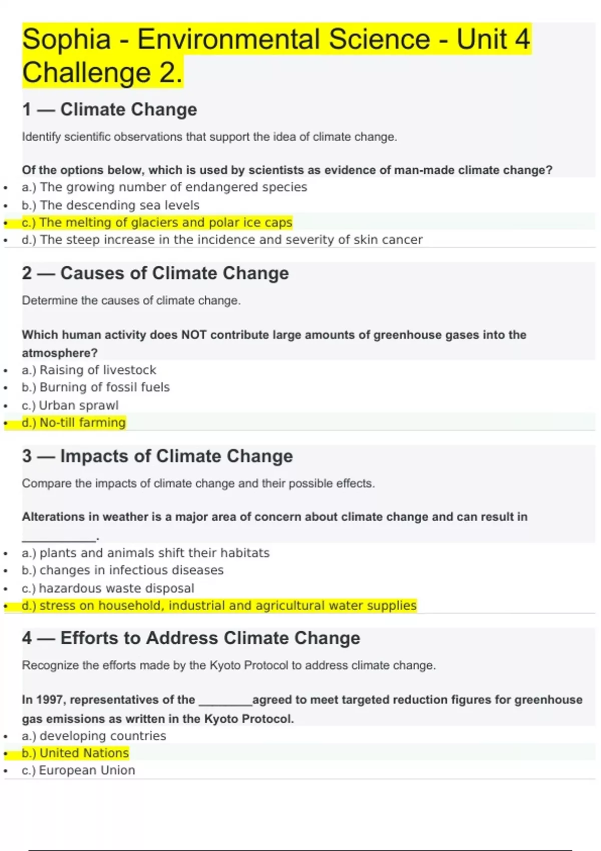 Sophia - Environmental Science - Unit 4 Challenge 2. 1 — Climate Change Identify scientific observations that support the idea of climate change. Of the options below, which is used by scientists as evidence of man-made climate change? • a.) The growing number of endangered species • b.) The descending sea levels • c.) The melting of glaciers and polar ice caps • d.) The steep increase in the incidence and severity of skin cancer 2 — Causes of Climate Change Determine the causes of climate change. Which human activity does NOT contribute large amounts of greenhouse gases into the atmosphere? • a.) Raising of livestock • b.) Burning of fossil fuels • c.) Urban sprawl • d.) No-till farming 3 — Impacts of Climate Change Compare the impacts of climate change and their possible effects. Alterations in weather is a major area of concern about climate change and can result in ___________. • a.) plants and animals shift their habitats • b.) changes in infectious diseases • c.) hazardous waste disposal • d.) stress on household, industrial and agricultural water supplies 4 — Efforts to Address Climate Change Recognize the efforts made by the Kyoto Protocol to address climate change. In 1997, representatives of the ________agreed to meet targeted reduction figures for greenhouse gas emissions as written in the Kyoto Protocol. • a.) developing countries • b.) United Nations • c.) European Union