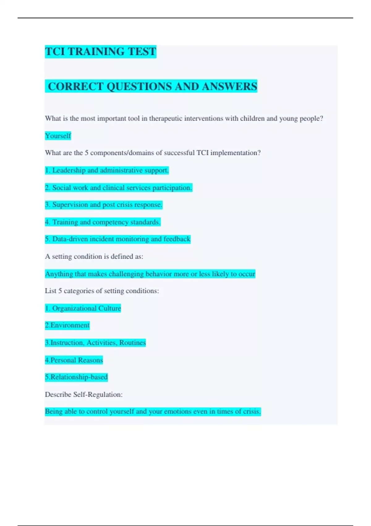 TCI TRAINING TEST CORRECT QUESTIONS AND ANSWERS What is the most important tool in therapeutic interventions with children and young people? Yourself What are the 5 components/domains of successful TCI implementation? 1. Leadership and administrative support. 2. Social work and clinical services participation. 3. Supervision and post crisis response. 4. Training and competency standards. 5. Data-driven incident monitoring and feedback A setting condition is defined as: Anything that makes challenging behavior more or less likely to occur List 5 categories of setting conditions: 1. Organizational Culture 2.Environment 3.Instruction, Activities, Routines 4.Personal Reasons 5.Relationship-based Describe Self-Regulation: Being able to control yourself and your emotions even in times of crisis. Behaviors recognized as "typical" for a particular young person is coined as: _______________ in the stress model of crisis Baseline behavior