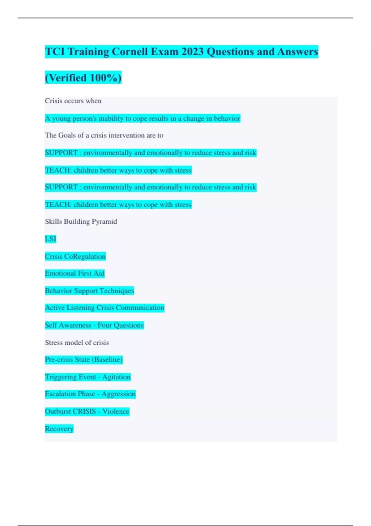TCI Training Cornell Exam 2023 Questions and Answers (Verified 100%) Crisis occurs when A young person's inability to cope results in a change in behavior The Goals of a crisis intervention are to SUPPORT : environmentally and emotionally to reduce stress and risk TEACH: children better ways to cope with stress SUPPORT : environmentally and emotionally to reduce stress and risk TEACH: children better ways to cope with stress Skills Building Pyramid LSI Crisis CoRegulation Emotional First Aid Behavior Support Techniques Active Listening Crisis Communication Self Awareness - Four Questions Stress model of crisis Pre-crisis State (Baseline) Triggering Event - Agitation Escalation Phase - Aggression Outburst CRISIS - Violence Recovery FOUR questions to ask ourselves in a crisis situation What am I feeling now? What does this young person feel need want