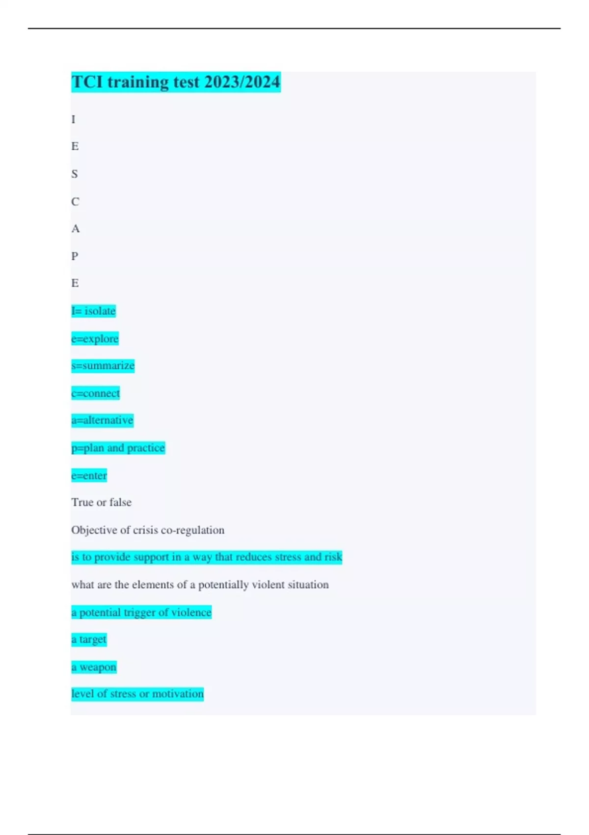 TCI training test 2023/2024 I E S C A P E I= isolate e=explore s=summarize c=connect a=alternative p=plan and practice e=enter True or false Objective of crisis co-regulation is to provide support in a way that reduces stress and risk what are the elements of a potentially violent situation a potential trigger of violence a target a weapon level of stress or motivation what are three nonverbal behaviors eye contact body language nods what are the conflict cycle steps in order stressful situation/incident young person's feelings Young person's behavior adult's response