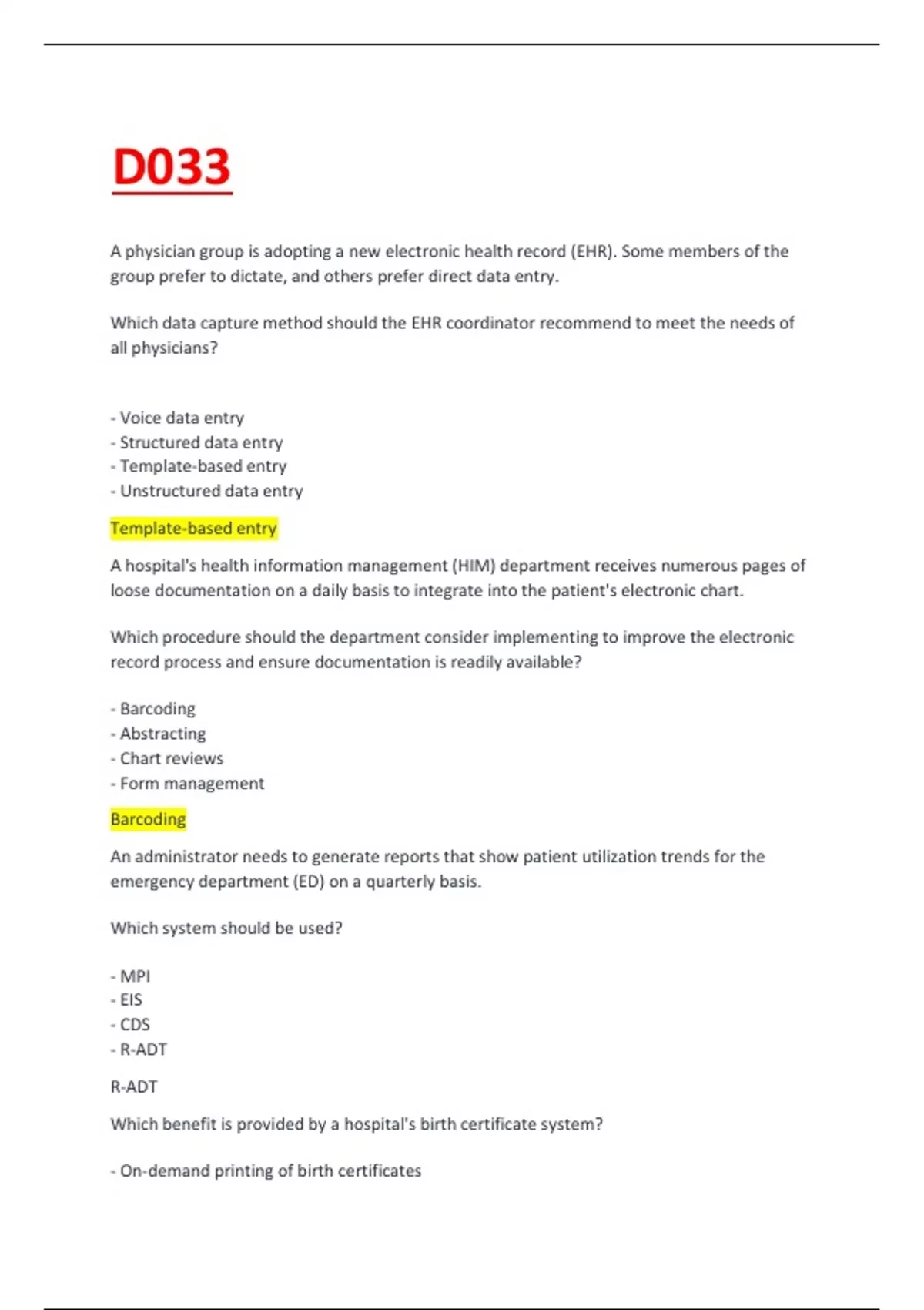 Template-based entry A hospital's health information management (HIM) department receives numerous pages of loose documentation on a daily basis to integrate into the patient's electronic chart. Which procedure should the department consider implementing to improve the electronic record process and ensure documentation is readily available? - Barcoding - Abstracting - Chart reviews - Form management Barcoding An administrator needs to generate reports that show patient utilization trends for the emergency department (ED) on a quarterly basis. Which system should be used?