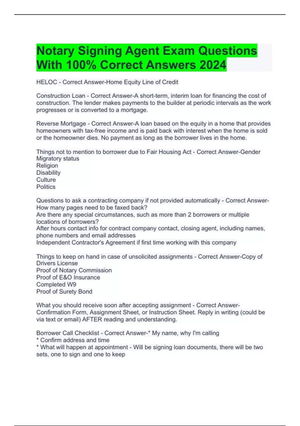 Notary Signing Agent Exam Questions With 100% Correct Answers 2024