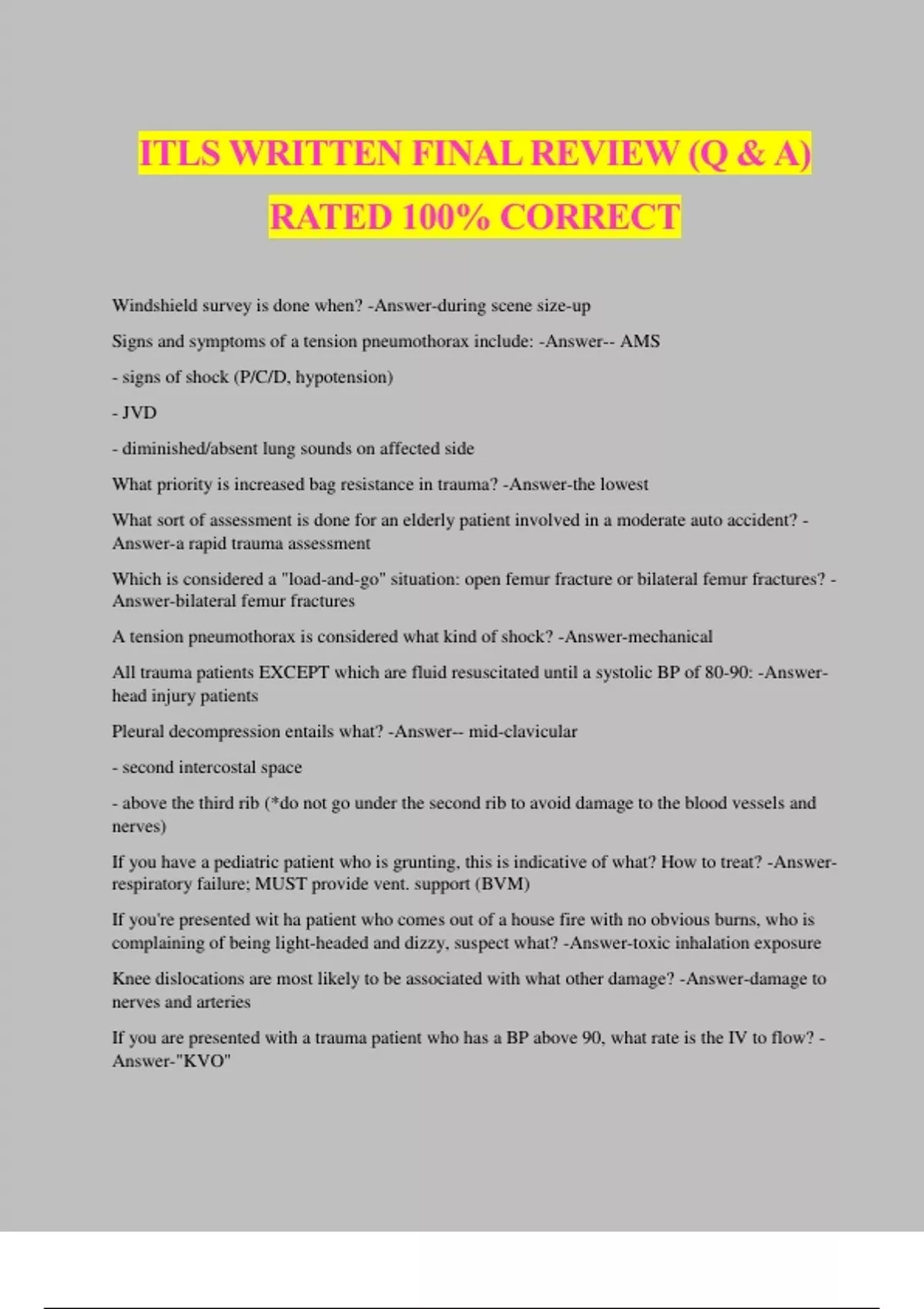 ITLS WRITTEN FINAL REVIEW (Q & A) RATED 100% CORRECT Windshield survey is done when? -Answer-during scene size-up Signs and symptoms of a tension pneumothorax include: -Answer-- AMS - signs of shock (P/C/D, hypotension) - JVD - diminished/absent lung sounds on affected side What priority is increased bag resistance in trauma? -Answer-the lowest What sort of assessment is done for an elderly patient involved in a moderate auto accident? - Answer-a rapid trauma assessment Which is considered a "load-and-go" situation: open femur fracture or bilateral femur fractures? - Answer-bilateral femur fractures A tension pneumothorax is considered what kind of shock? -Answer-mechanical All trauma patients EXCEPT which are fluid resuscitated until a systolic BP of 80-90: -Answer- head injury patients Pleural decompression entails what? -Answer-- mid-clavicular - second intercostal space - above the third rib (*do not go under the second rib to avoid damage to the blood vessels and nerves) If you have a pediatric patient who is grunting, this is indicative of what? How to treat? -Answer- respiratory failure; MUST provide vent. support (BVM) If you're presented wit ha patient who comes out of a house fire with no obvious burns, who is complaining of being light-headed and dizzy, suspect what? -Answer-toxic inhalation exposure Knee dislocations are most likely to be associated with what other damage? -Answer-damage to nerves and arteries If you are presented wi