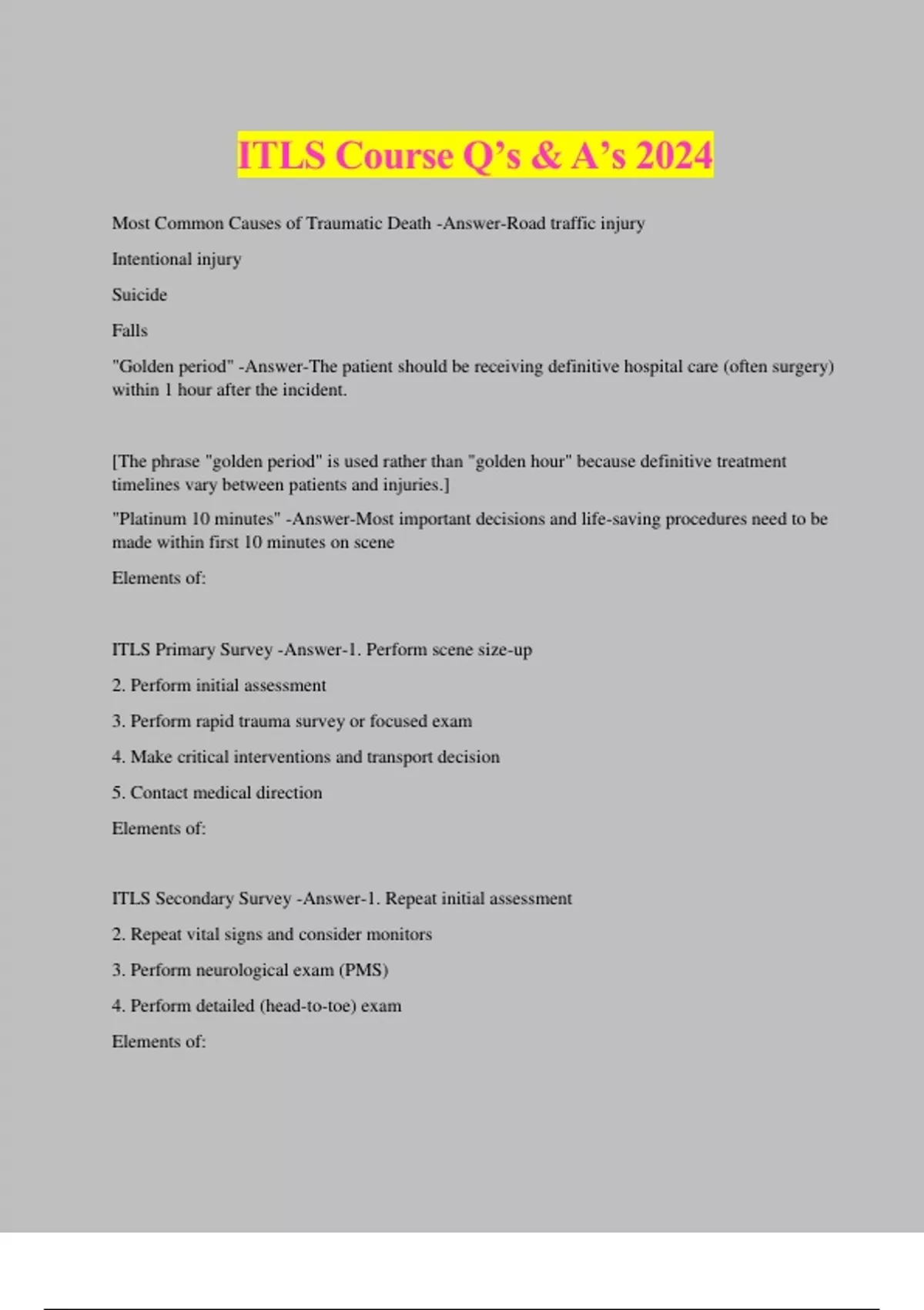 ITLS Course Q’s & A’s 2024 Most Common Causes of Traumatic Death -Answer-Road traffic injury Intentional injury Suicide Falls "Golden period" -Answer-The patient should be receiving definitive hospital care (often surgery) within 1 hour after the incident. [The phrase "golden period" is used rather than "golden hour" because definitive treatment timelines vary between patients and injuries.] "Platinum 10 minutes" -Answer-Most important decisions and life-saving procedures need to be made within first 10 minutes on scene Elements of: ITLS Primary Survey -Answer-1. Perform scene size-up 2. Perform initial assessment 3. Perform rapid trauma survey or focused exam 4. Make critical interventions and transport decision 5. Contact medical direction Elements of: ITLS Secondary Survey -Answer-1. Repeat initial assessment 2. Repeat vital signs and consider monitors 3. Perform neurological exam (PMS) 4. Perform detailed (head-to-toe) exam Elements of: ITLS Reassessment Survey -Answer-1. Repeat initial assessment 2. Repeat vital signs and check monitors 3. Reassess the abdomen 4. Check injuries and interventions First step of ITLS Primary Survey -Answer-Scene Size-Up Elements of: Scene Size-Up -Answer-1. Standard precautions (PPE) 2. Scene safety 3. Initial triage (total # pts) 4. Need for more help or equipment (additional resources) 5. Mechanism of injury Windshield Survey -Answer-Part of assessing scene safety Look for hazards and threats before leaving your response vehicle The baseline of trauma care -Answer-Mechanism of Injury (MOI) Generalized MOI -Answer-May require rapid trauma survey Significant MOI, likely numerous severe injuries to patient Focused MOI -Answer-May only require focused exam Patient only has a localized injury The _________ of the object has the greater effect on traumatic injury -Answer-speed _______________ injuries are responsible for majority of mortality from trauma in US and industrial world -Answer-Motion (mechanical) __________ trauma is more common in rural settings -Answer-Blunt Types of Blunt Injuries -Answer-Rapid forward deceleration Rapid vertical deceleration Blunt instrument energy transfer Rapid forward deceleration -Answer-Usually blunt, may be penetrating Most common example of rapid forward deceleration is ______________ -Answer-Motor vehicle collision (MVC) Rapid vertical deceleration -Answer-Falls ____________ are prevalent in children and older adults due to developmental and age related factors -Answer-Falls Blunt instrument energy transfer -Answer-Risk of high energy transfer to an isolated tissue area (where vital organ may be located) Events of a Motor Vehicle Collision (MVC) -Answer-1. Machine Collision - when vehicle motion is stopped 2. Body Collision - when body motion is stopped (by vehicle) 3. Organ Collision - when organ motion is sto