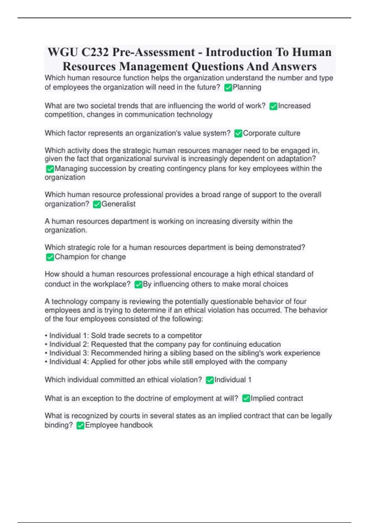 WGU C232 Pre-Assessment - Introduction To Human Resources Management Questions And Answers WGU C232 Pre-Assessment - Introduction To Human Resources Management Questions And Answers