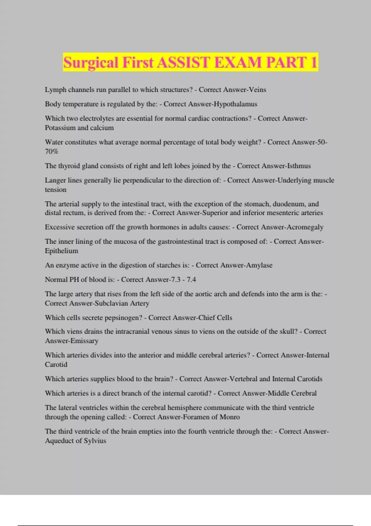 Surgical First ASSIST EXAM PART 1 Lymph channels run parallel to which structures? - Correct Answer-Veins Body temperature is regulated by the: - Correct Answer-Hypothalamus Which two electrolytes are essential for normal cardiac contractions? - Correct Answer- Potassium and calcium Water constitutes what average normal percentage of total body weight? - Correct Answer-50- 70% The thyroid gland consists of right and left lobes joined by the - Correct Answer-Isthmus Langer lines generally lie perpendicular to the direction of: - Correct Answer-Underlying muscle tension The arterial supply to the intestinal tract, with the exception of the stomach, duodenum, and distal rectum, is derived from the: - Correct Answer-Superior and inferior mesenteric arteries Excessive secretion off the growth hormones in adults causes: - Correct Answer-Acromegaly The inner lining of the mucosa of the gastrointestinal tract is composed of: - Correct Answer- Epithelium