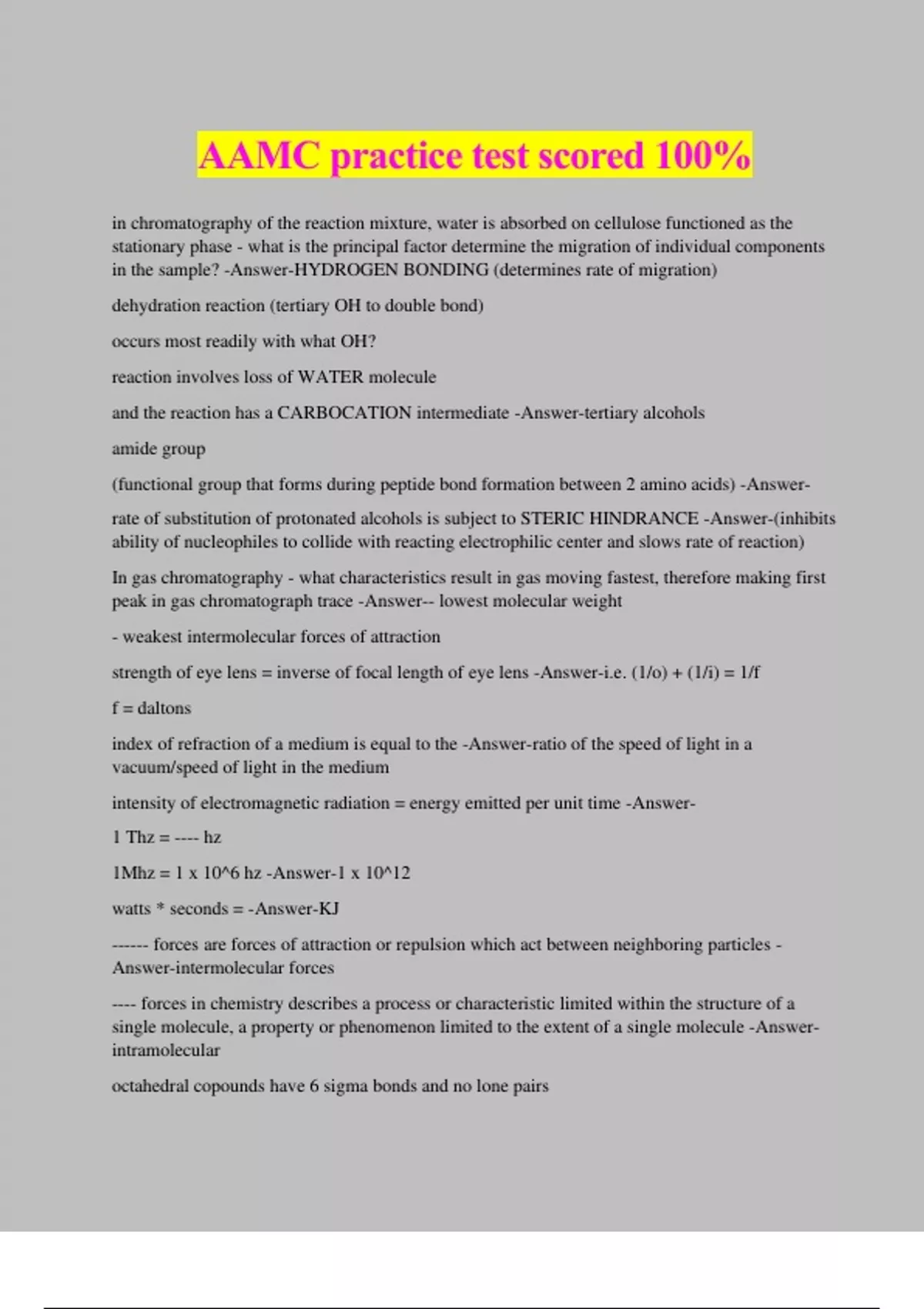 AAMC practice test scored 100% in chromatography of the reaction mixture, water is absorbed on cellulose functioned as the stationary phase - what is the principal factor determine the migration of individual components in the sample? -Answer-HYDROGEN BONDING (determines rate of migration) dehydration reaction (tertiary OH to double bond) occurs most readily with what OH? reaction involves loss of WATER molecule and the reaction has a CARBOCATION intermediate -Answer-tertiary alcohols amide group (functional group that forms during peptide bond formation between 2 amino acids) -Answer- rate of substitution of protonated alcohols is subject to STERIC HINDRANCE -Answer-(inhibits ability of nucleophiles to collide with reacting electrophilic center and slows rate of reaction) In gas chromatography - what characteristics result in gas moving fastest, therefore making first peak in gas chromatograph trace -Answer-- lowest molecular weight - weakest intermolecular forces of attraction strength of eye lens = inverse of focal length of eye lens -Answer-i.e. (1/o) + (1/i) = 1/f f = daltons index of refraction of a medium is equal to the -Answer-ratio of the speed of light in a vacuum/speed of light in the medium intensity of electromagnetic radiation = energy emitted per unit time -Answer- 1 Thz = ---- hz 1Mhz = 1 x 10^6 hz -Answer-1 x 10^12 watts * seconds = -Answer-KJ ------ forces are forces of attraction or repulsion which act between neighboring particles - Answer-intermolecular forces ---- forces in chemistry describes a process or characteristic limited within the structure of a single molecule, a property or phenomenon limited to the extent of a single molecule -Answer- intramolecular octahedral copounds have 6 sigma bonds and no lone pairs - requires the hybridization of six atomic orbitals (what type of orbitals are involved in boding in octahedral compounds?) -Answer-d^2 sp^3 assumptions of IDEAL GAS LAW *LOOK up other assumptions -Answer-individual molecular volume and intermolecular forces are neglible enzyme that hydrolyzes fatty acids -Answer-lipase RNA: ribose -Answer- uridine (is a ribose) -Answer- radioactive beta (-) decay -Answer-neutron is converted to proton ratio of image heigh to object height is equal to the ratio of lens-imaging distance to object-lens distance -Answer-use equation (1/object + 1/image = 1/f) gamma decay occurs when a nucleus emits a -Answer-photon REVIEW GALVANIC CELLS/ ELECTRICAL POTENTIAL -Answer- a SPONTANEOUS reaction occurs when Eo is --- than zero -Answer-greater than ze